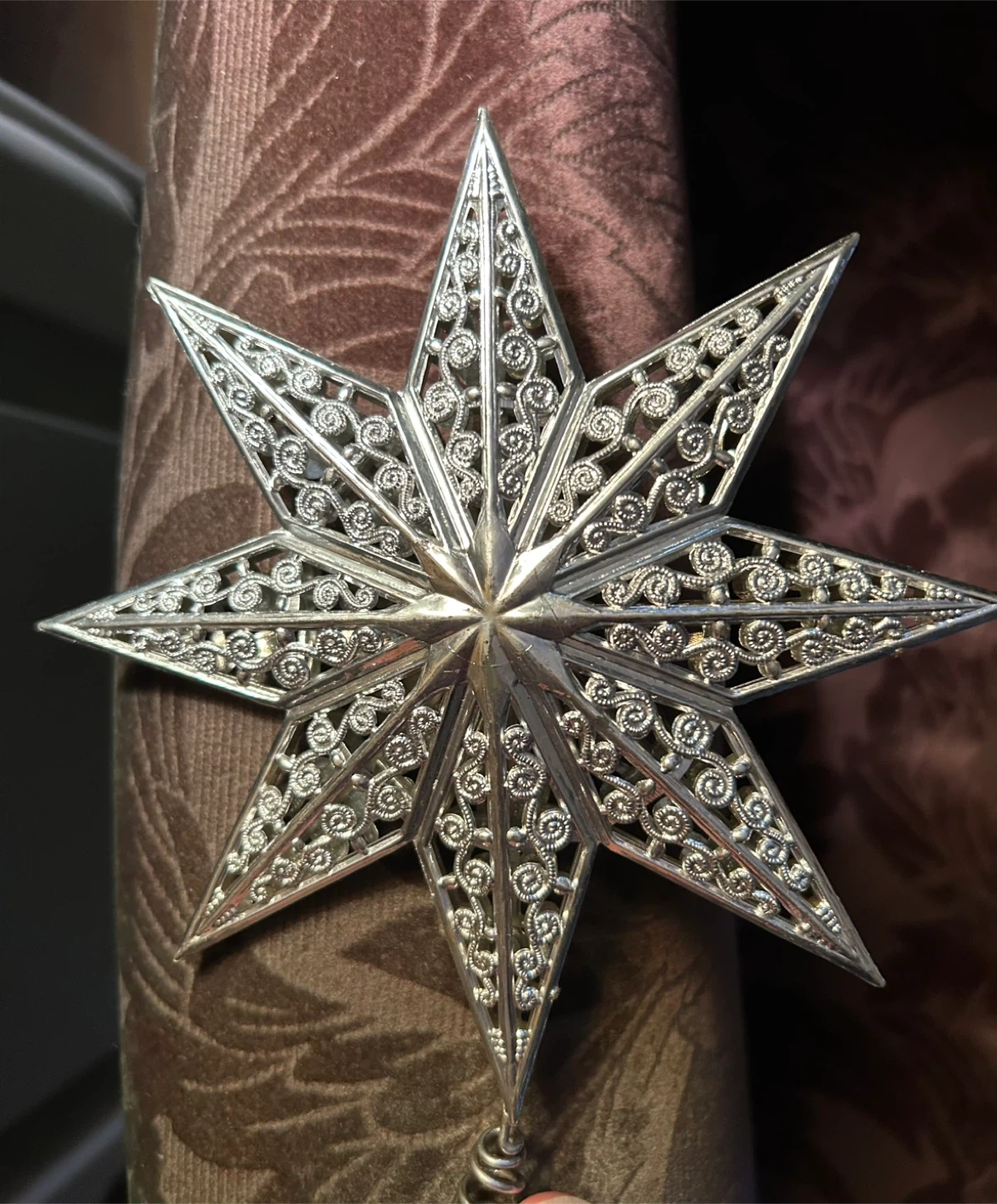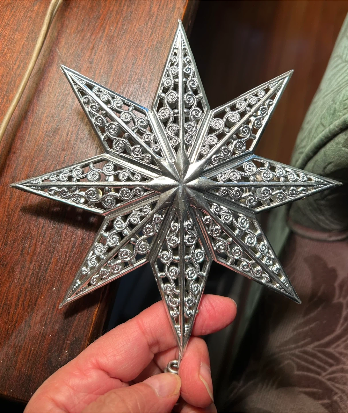 $10 MCM Vintage Silver Star Christmas Tree Topper Classic Design 7” Small Xmas decoration bulb decor Vintage Silver Star Christmas Tree Topper Classic Design From my aunt's home I grew up knowing this star on her tree The attachments been pulled and a bit wonky This is a wonderful, vintage, silver Christmas tree star topper ! It measures 7 inches long, including the base, and 6 inches wide. It’s on the small side, so it’s perfect for a small size tree. It’s lightweight, made of plastic/metal, and has a wonderful, swirly design. It’s a very classic-looking, Christmas tree star topper! See also the angel topper I have for sale at $12 1O.00 Flexible re pickup Elmsdale Road M4J 3M3 Donlands O'Connor East York Don Mills south exit off DVP Just south of Leaside Bridge