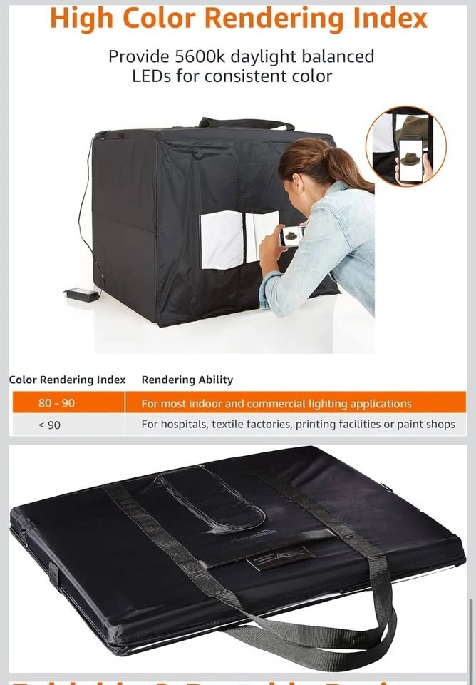 - High output built-in LED lights for handheld photography with a camera or smartphone. Lights are positioned for optimum contrast, and provide 5600k daylight balanced LEDs with high Color -Rendering Index (CRI) for consistent color. An extra light provides directional light modelling like in a photo studio, giving better highlights, contrast, and shape to product images.