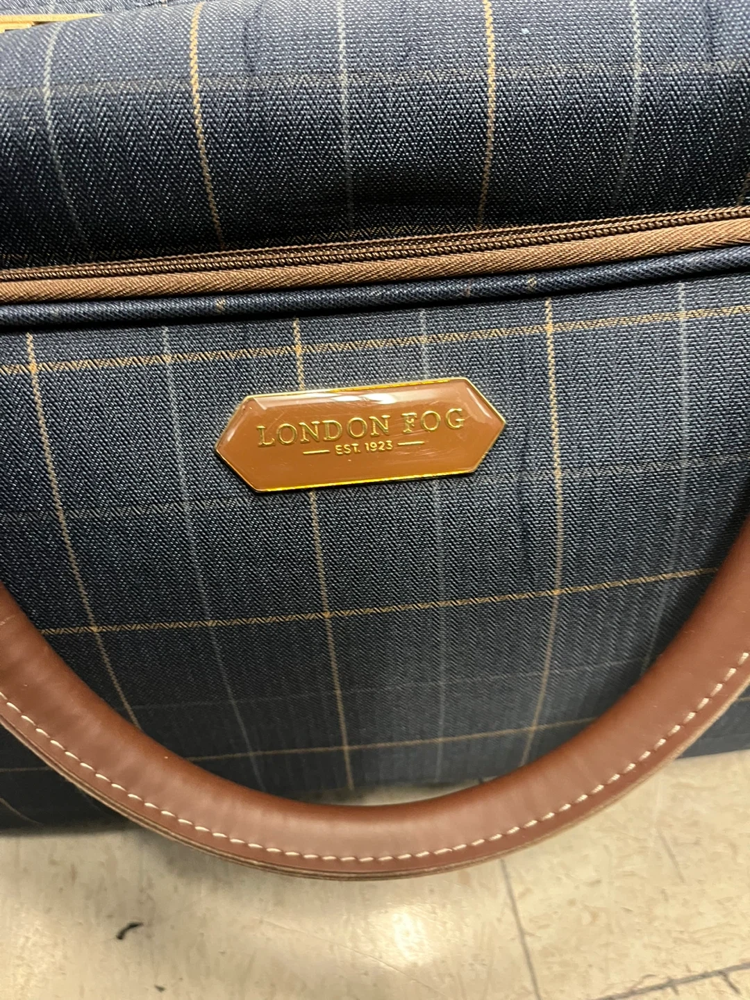 Here's a London Fog duffle bag up for grabs! It features a classic plaid pattern in blue and brown, with brown handles and trim. The bag has a zippered closure and a front pocket for extra storage. It's in great condition and ready for your next trip!