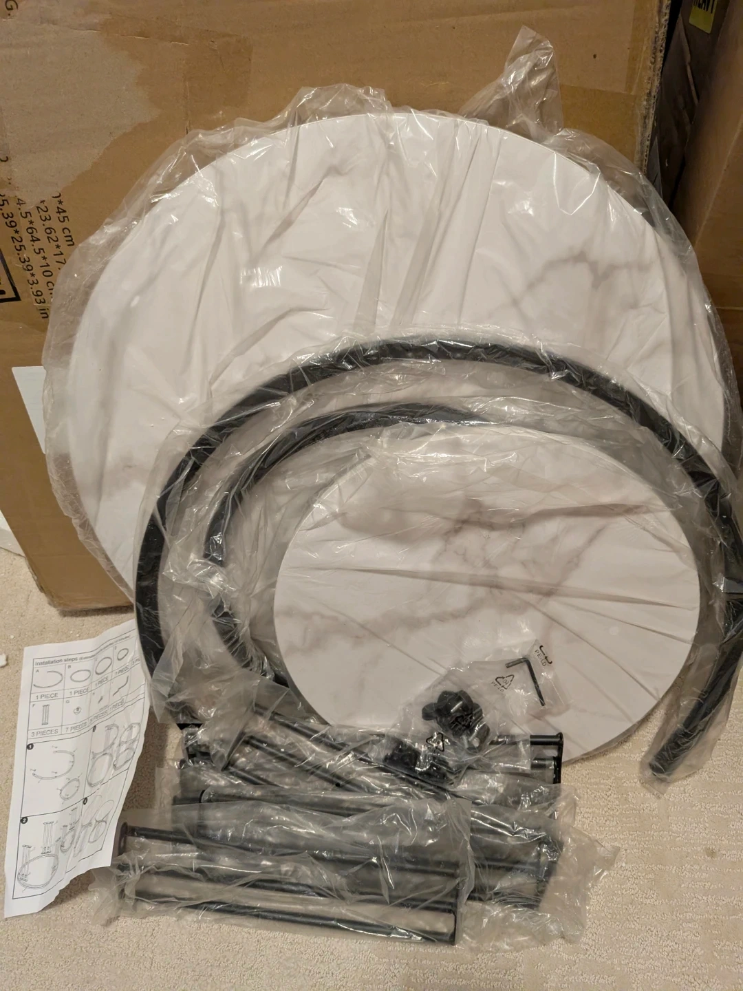Selling a set of Garden 4 You coffee tables in white and black. These nesting tables are perfect for small spaces and can be used as end tables or nightstands. The sleek round design and adjustable feet make them a stylish and practical addition to any living room or bedroom. Product dimensions are 23.6 inches and 17.7 inches in height, and 15.7 inches in diameter.