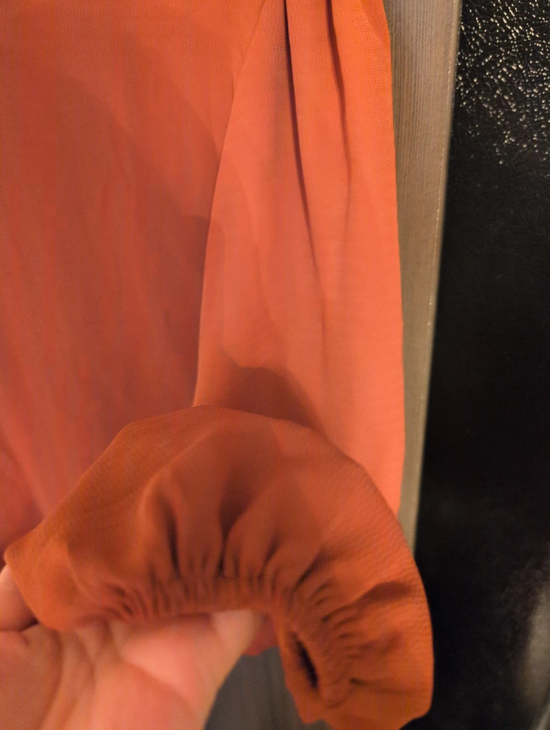 This is a long-sleeved blouse in a lovely wine red colour! It features a unique neckline and comfortable sleeves. Perfect for adding a pop of colour to your wardrobe. Size large from Suzy