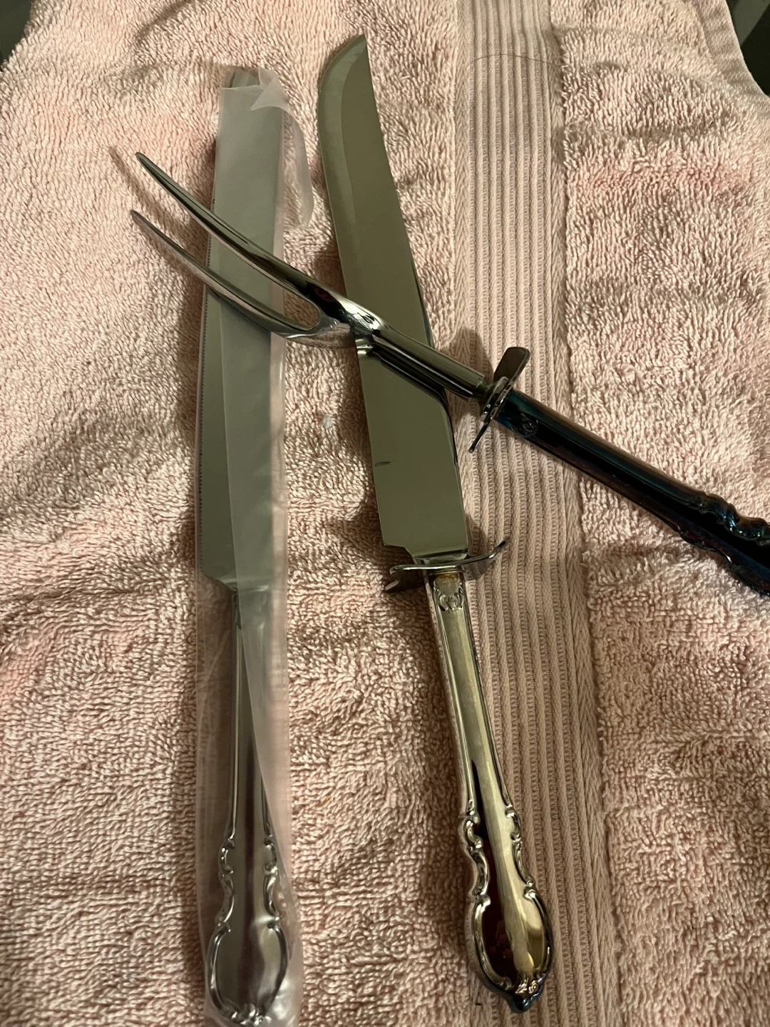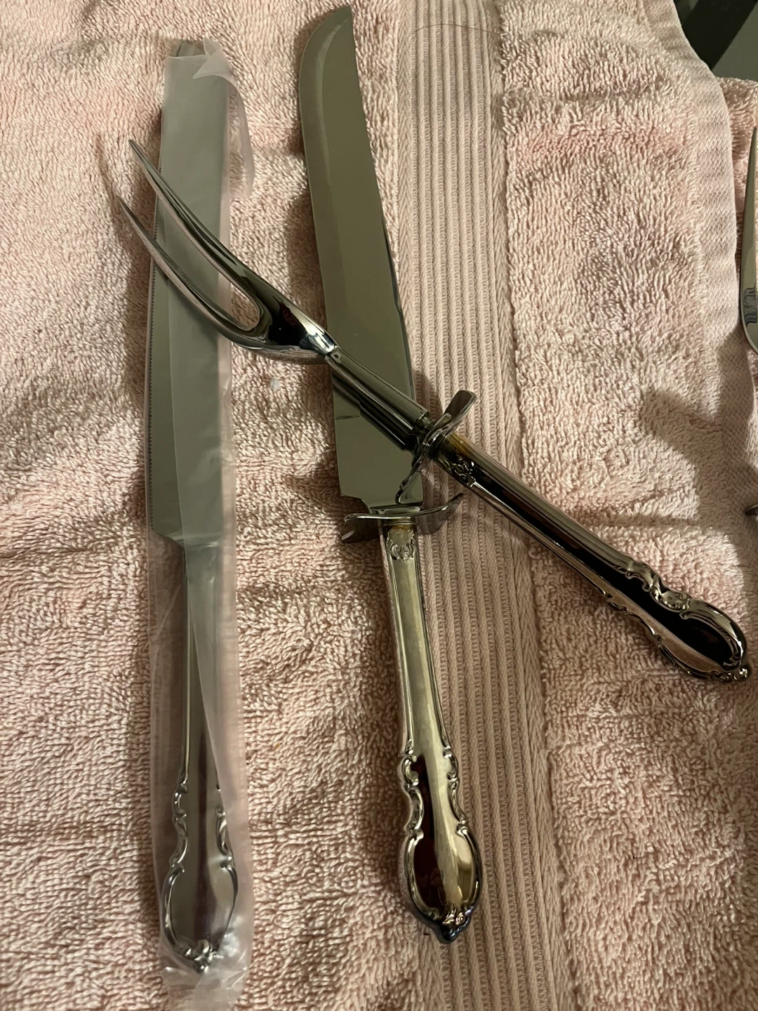 Selling a vintage carving knife and fork set with ornate silver plated handles. The set includes two carving knife and a carving fork, perfect for holiday dinners or special occasions! The knife is still in its original packaging. Never used