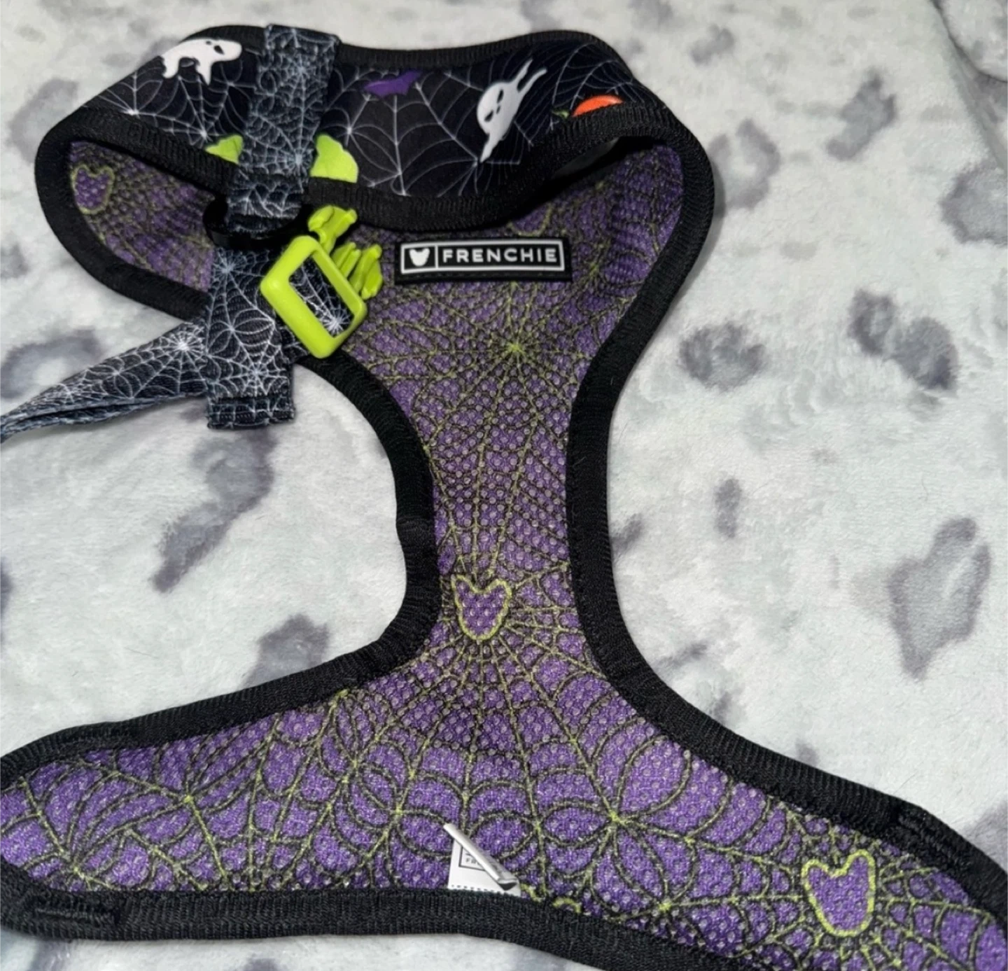 How cute is this Frenchie brand dog harness? It's Medium size and has a fun Halloween theme with ghosts, bats, spiderwebs, and pumpkins! Perfect for your small pup to celebrate the spooky season.