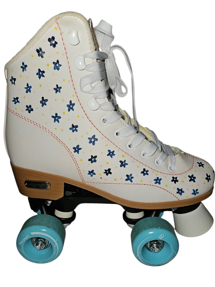 Roller Derby The Cruz Rush 72 High Top. The composite boot features reinforced ankle support. Equipped with high quality 54mm x 32mm Polyurethane wheels to absorb bumps & vibrations. Great for the rink or the sidewalk. Silver - 5speed rated carbon bearings. Lightweight chassis is strong & features a fixed toe stop. American company since 1936. EUC. Was painted with flowers. Wheels slightly dirty from use. No Box