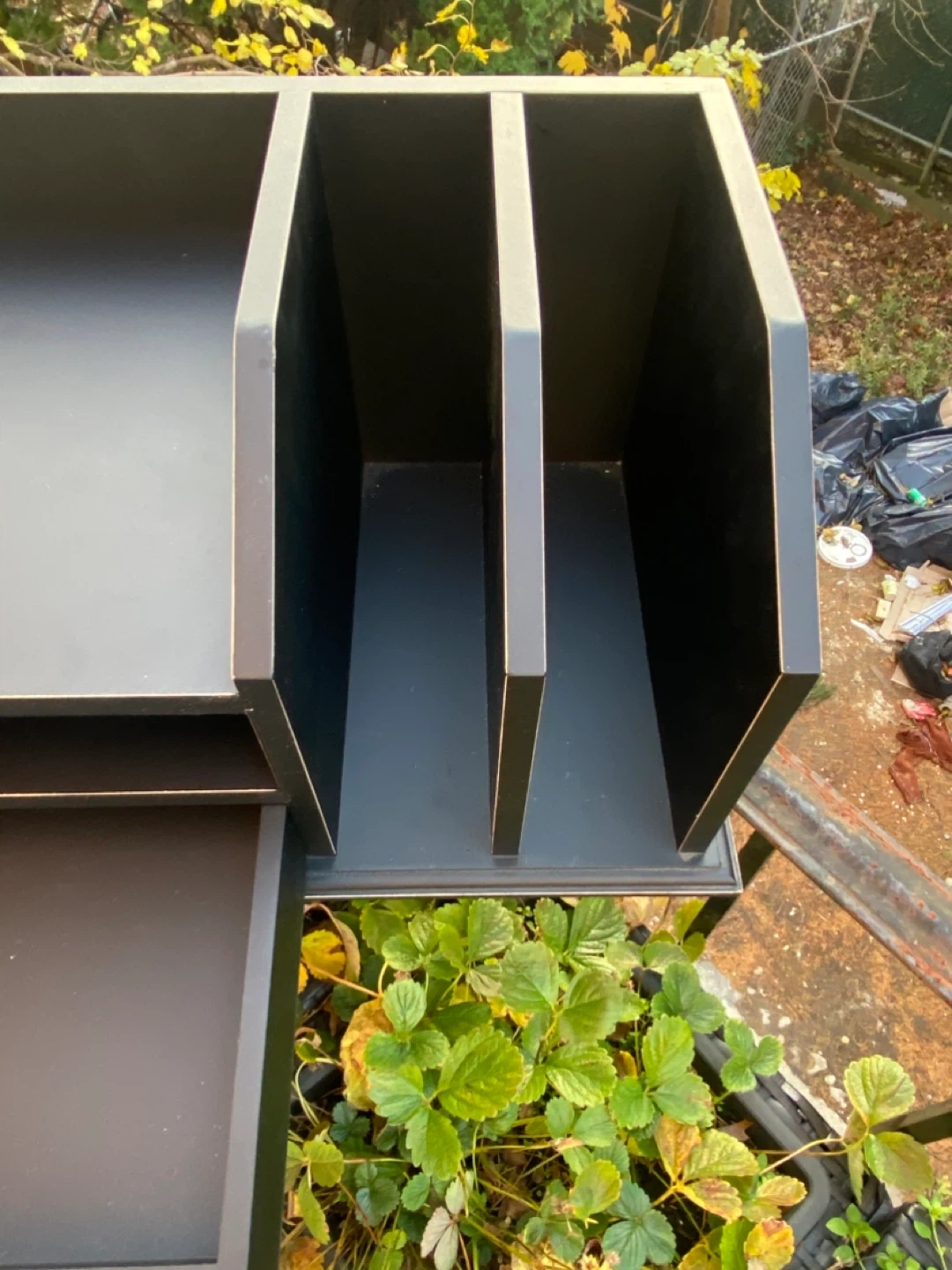 Here is a black wooden desk organizer. It has a drawer and multiple compartments for organizing your documents and supplies. It's in good condition and ready to help you tidy up your workspace!