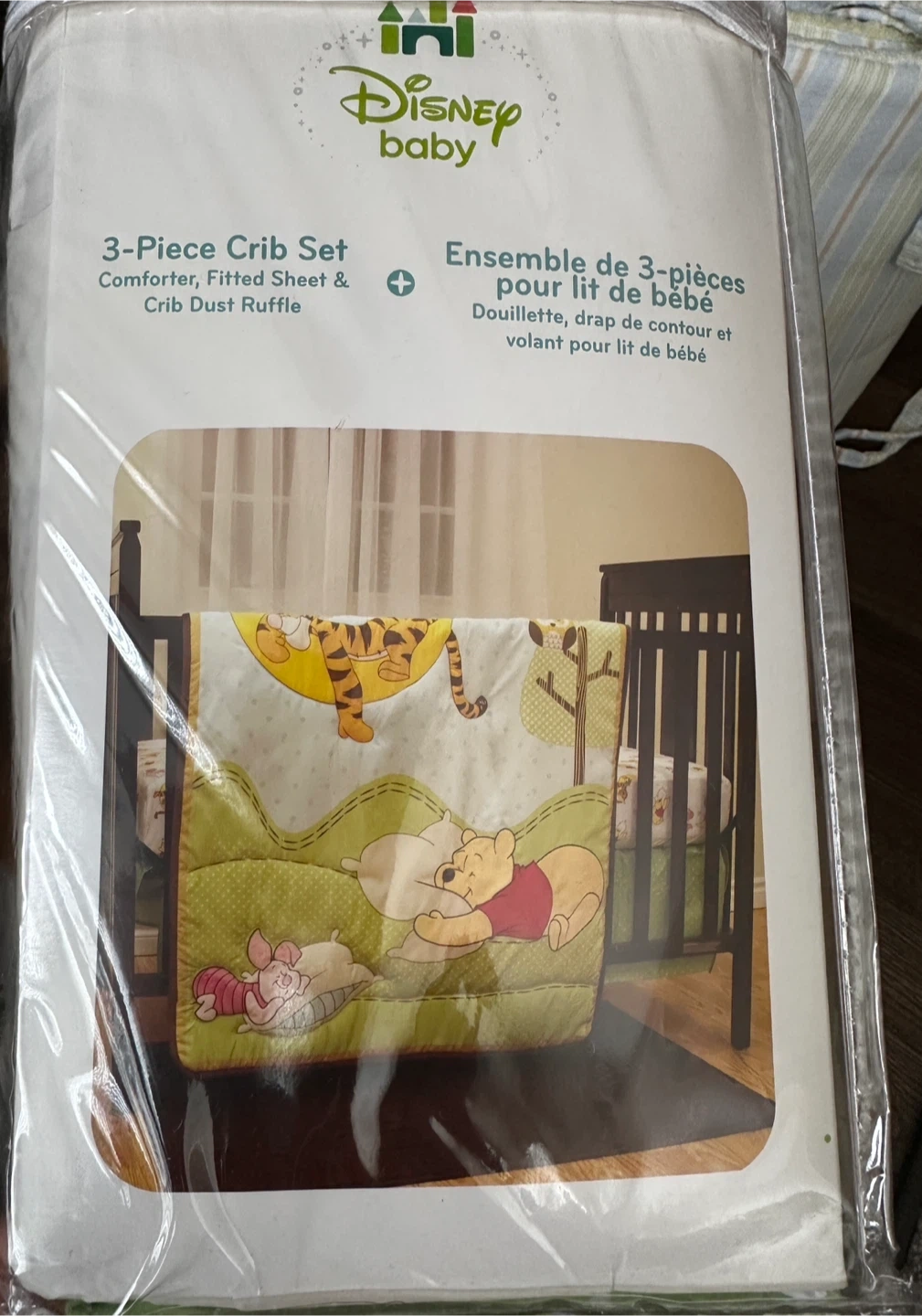 Selling a brand new, still-in-package Disney Baby 3-Piece Crib Set. Includes a comforter, fitted sheet and crib dust ruffle. Super cute Winnie the Pooh design.