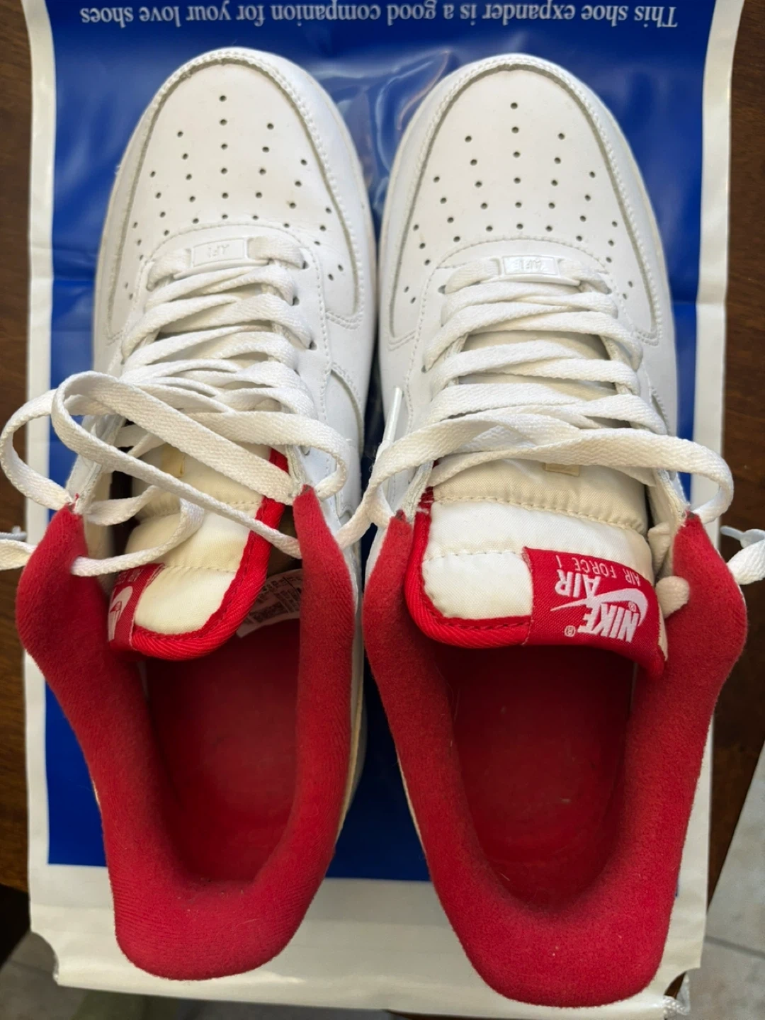 Selling a pair of Nike Air Force 1 sneakers in white and red. They are in good condition. Side 8.5