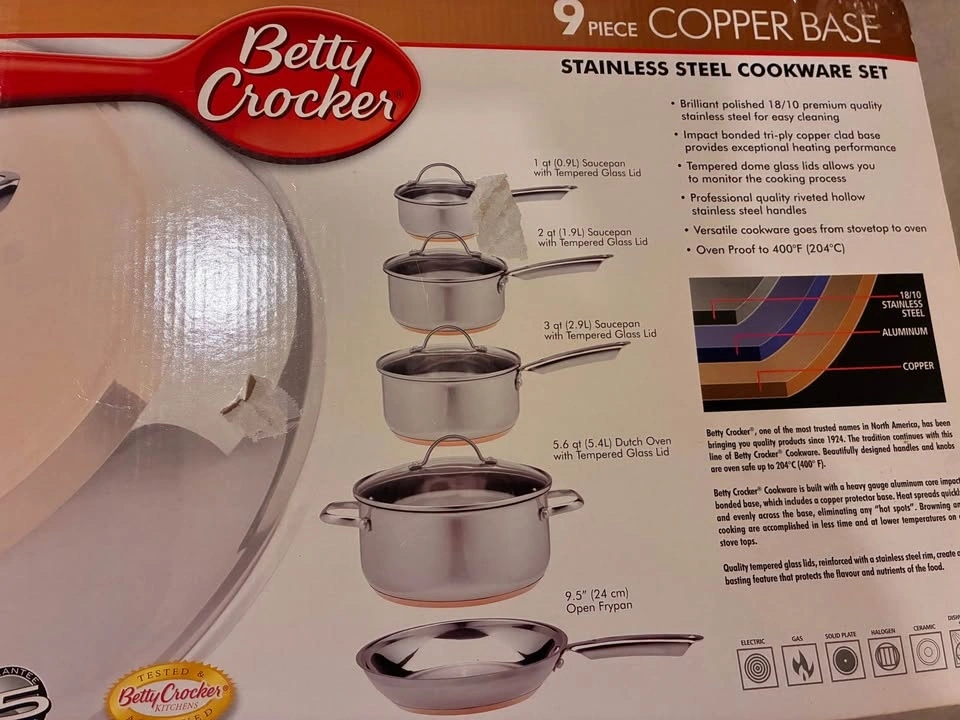 Buy & SellBetty Crocker 9 pieces Copper Base cookware setBetty Crocker 9 pieces Copper Base cookware set$80Brand new in the box, 9-piece copper base cookware set. Pick up in Markham (Warden / Highway 7 area).WHERE TO MEETCheck LocationView MapSELLERErnieButtonville100 reviews0 chats·1 favorites·9 views