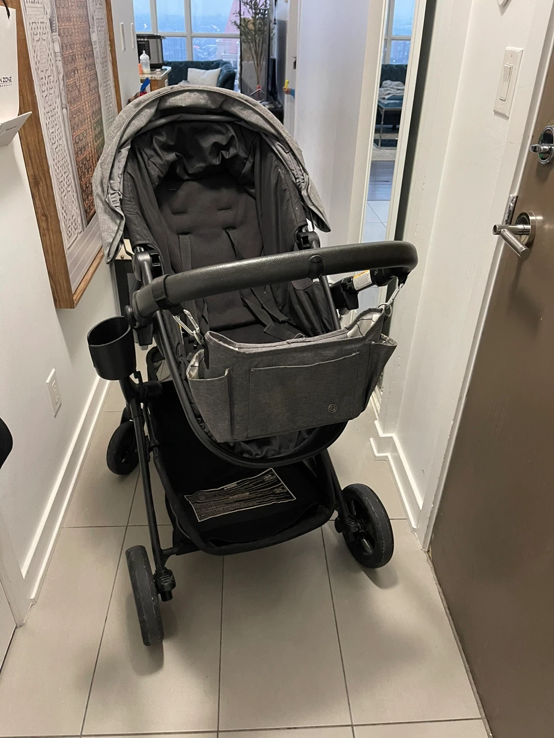 Great condition and very comfortable stroller. Leather handbar, cup holder, snack tray for toddler seat. Many different configurations, including parent facing and bassinet option.