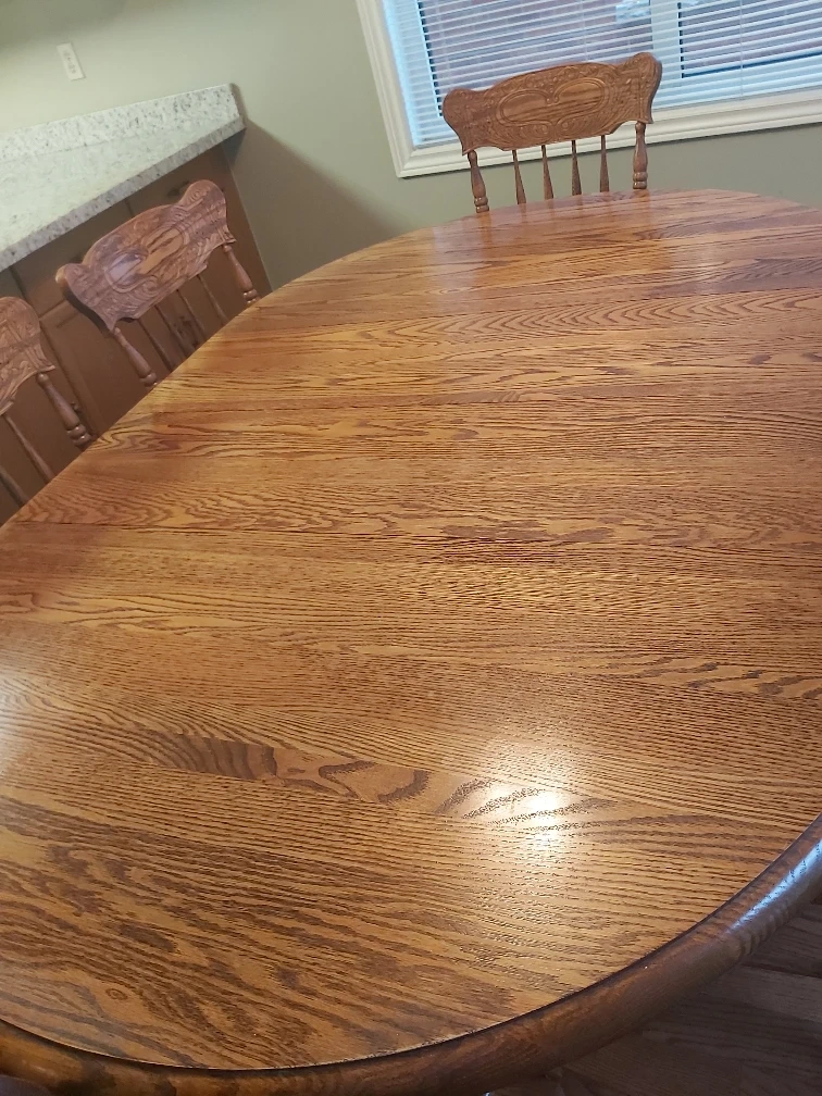 Big middle pedestal leg with 4 support feet. Rich medium grain. This table was regularly lemon oil treated and always had a tablecloth on it.