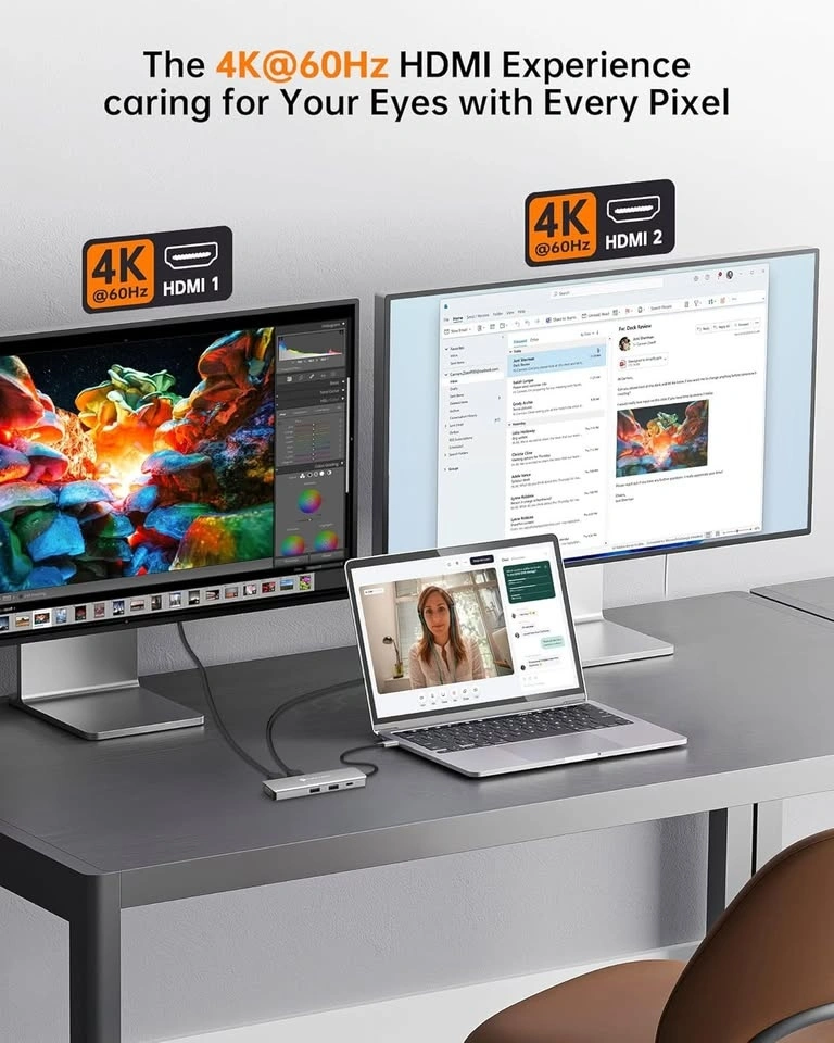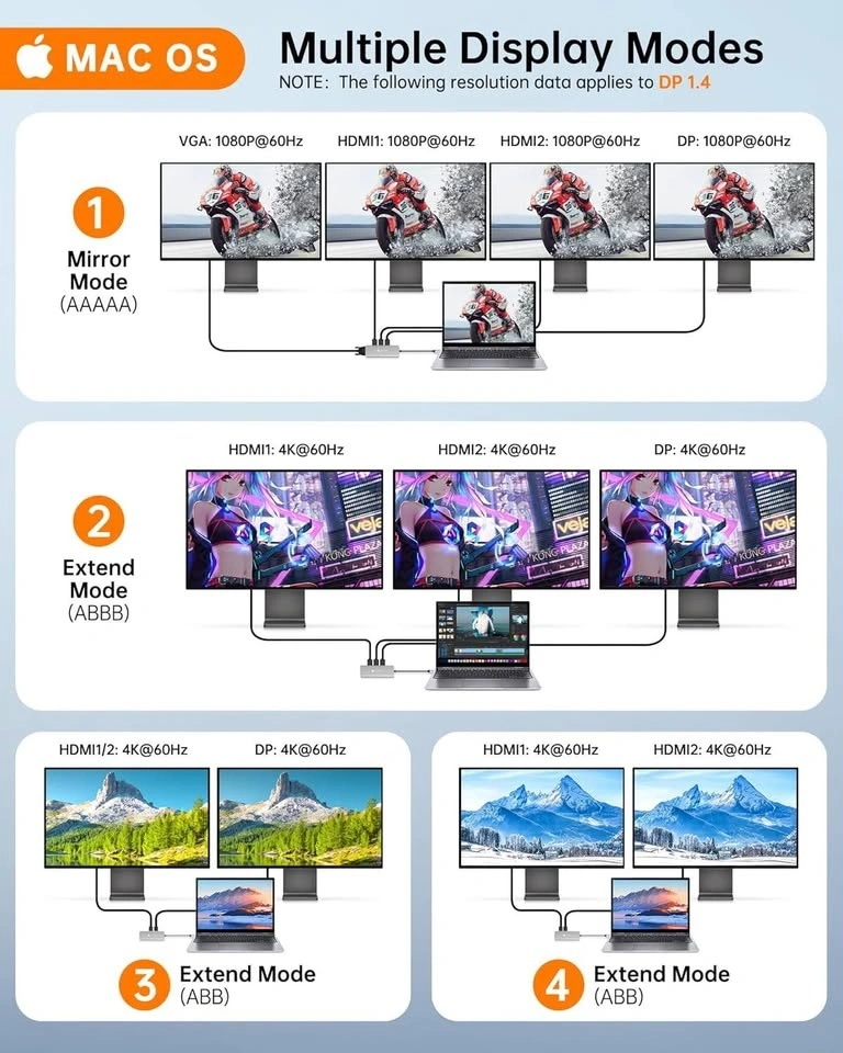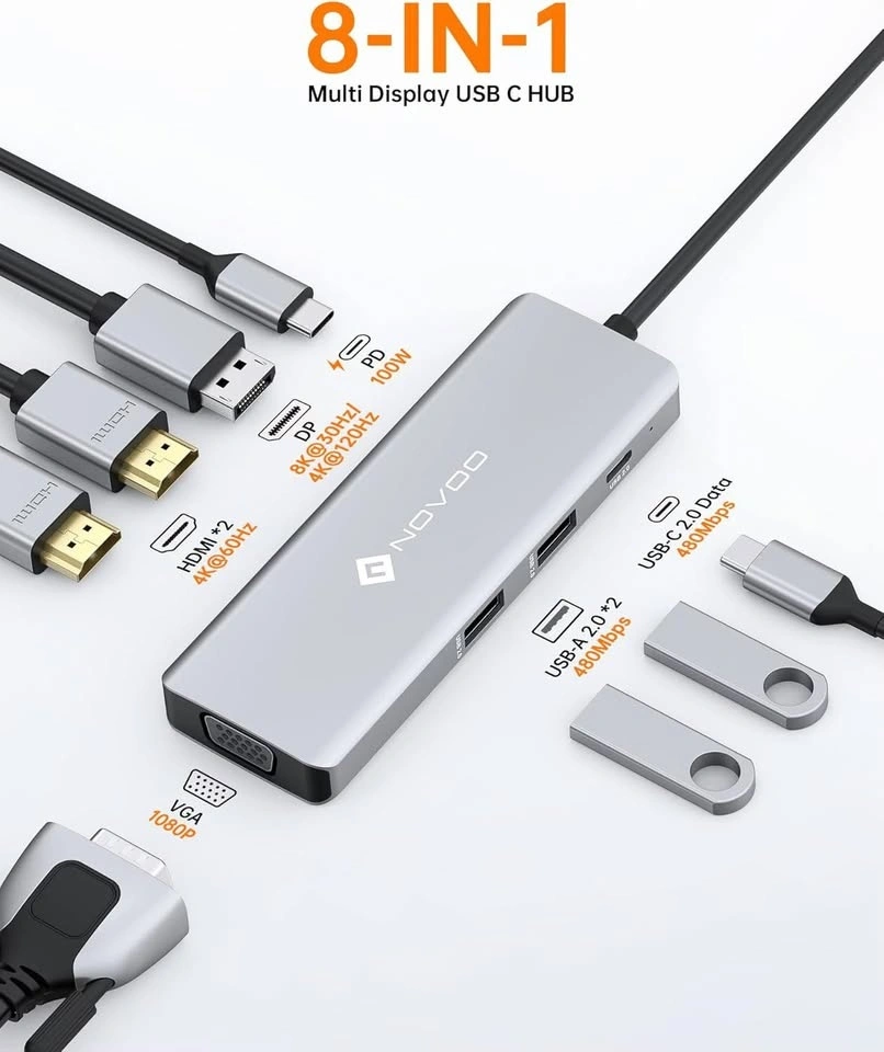 NOVOO USB C Docking Station Quad Display 8-in-1 USB C Hub Dual Monitor, 8K@30Hz DP, 2HDMI 4K@60Hz, VGA, 3 USB Ports, PD 100W Laptop Dock for iPhone 15, MacBook, Dell, HP, Lenovo Laptops