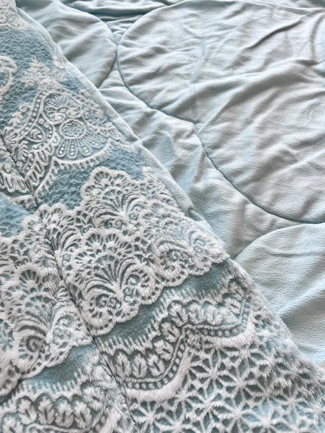 The soft sky-blue background with delicate white patterns creates a bright and calming atmosphere in any room.