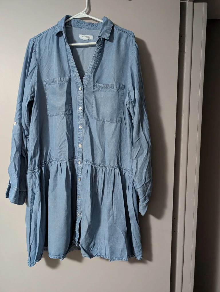 Selling a variety of women's clothing items. The collection includes a white cardigan, a denim dress, a pink blouse, a striped long-sleeve shirt, and a floral kimono. Perfect for refreshing your wardrobe!