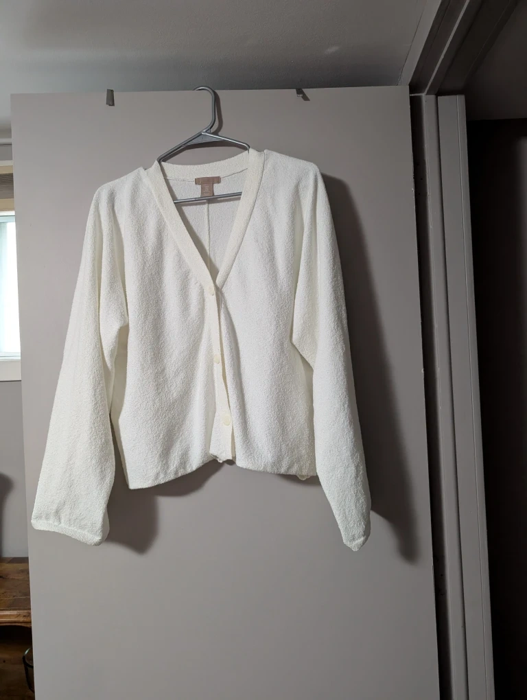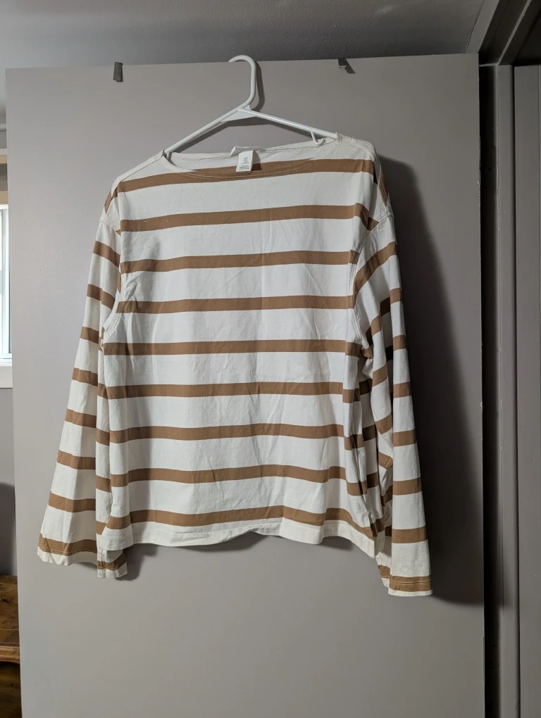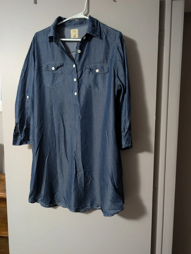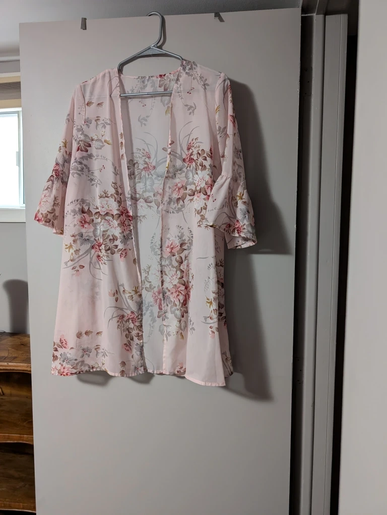 Selling a variety of women's clothing items. The collection includes a white cardigan, a denim dress, a pink blouse, a striped long-sleeve shirt, and a floral kimono. Perfect for refreshing your wardrobe!