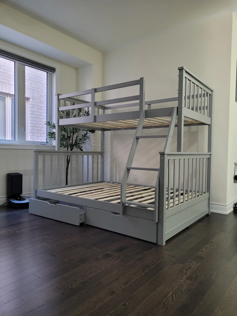 Selling a sturdy grey wooden bunk bed! It's in great shape and features a built-in ladder for easy access to the top bunk. The bottom bunk doesn't have drawers. Perfect for kids' rooms or guest rooms!