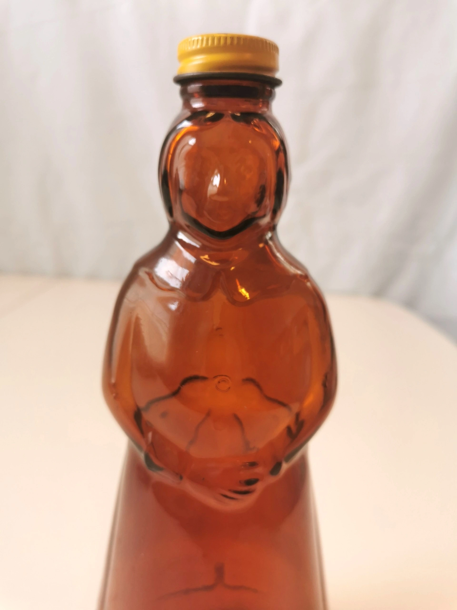 This is a beautiful and highly collectible vintage amber glass figural syrup bottle, consistent with the style used for the Aunt Jemima brand in the mid 1970s. This style of bottle, featuring the iconic likeness of a woman in an apron, has become a sought-after piece of food advertising and Black Americana history since the brand was retired in 2021.