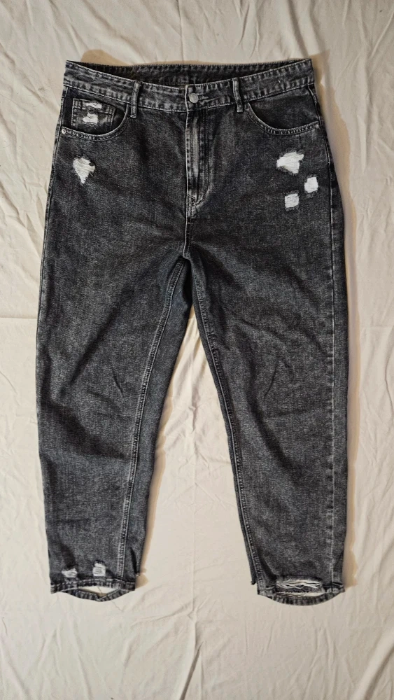 Here's a pair of distressed dark grey wash jeans. They're in good condition and ready for a new owner! They have a few rips and tears for a cool, edgy look. Size 12 women's