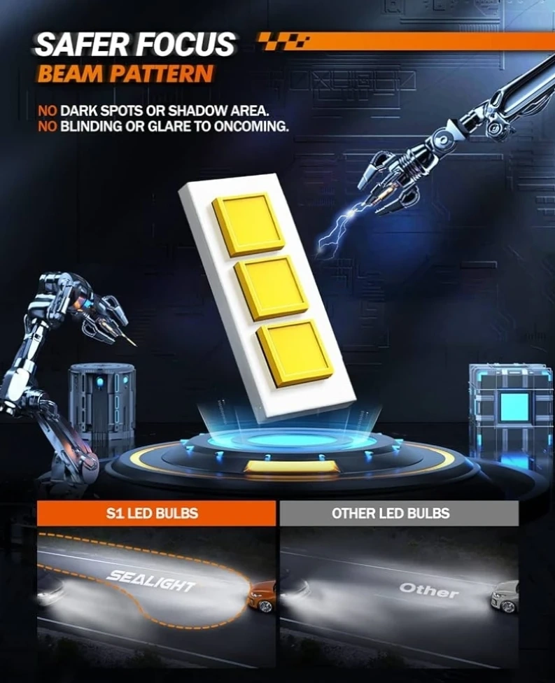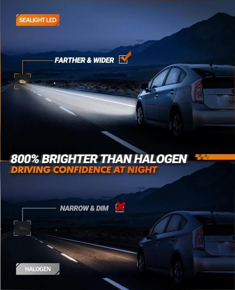 SEALIGHT Scoparc 9005/HB3 LED Headlight Bulbs. These are 800% brighter than halogen bulbs and have a 6000K cool white light. They feature a fanless design and are plug and play for easy installation. Enjoy a safer focus beam pattern with no dark spots or shadow areas, and no blinding or glare to oncoming traffic