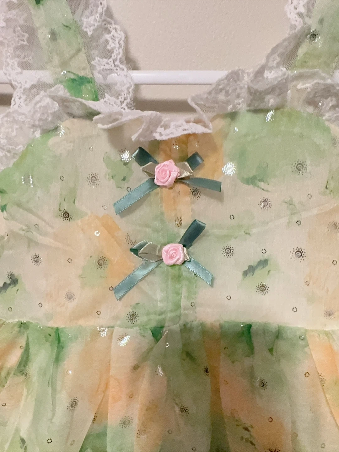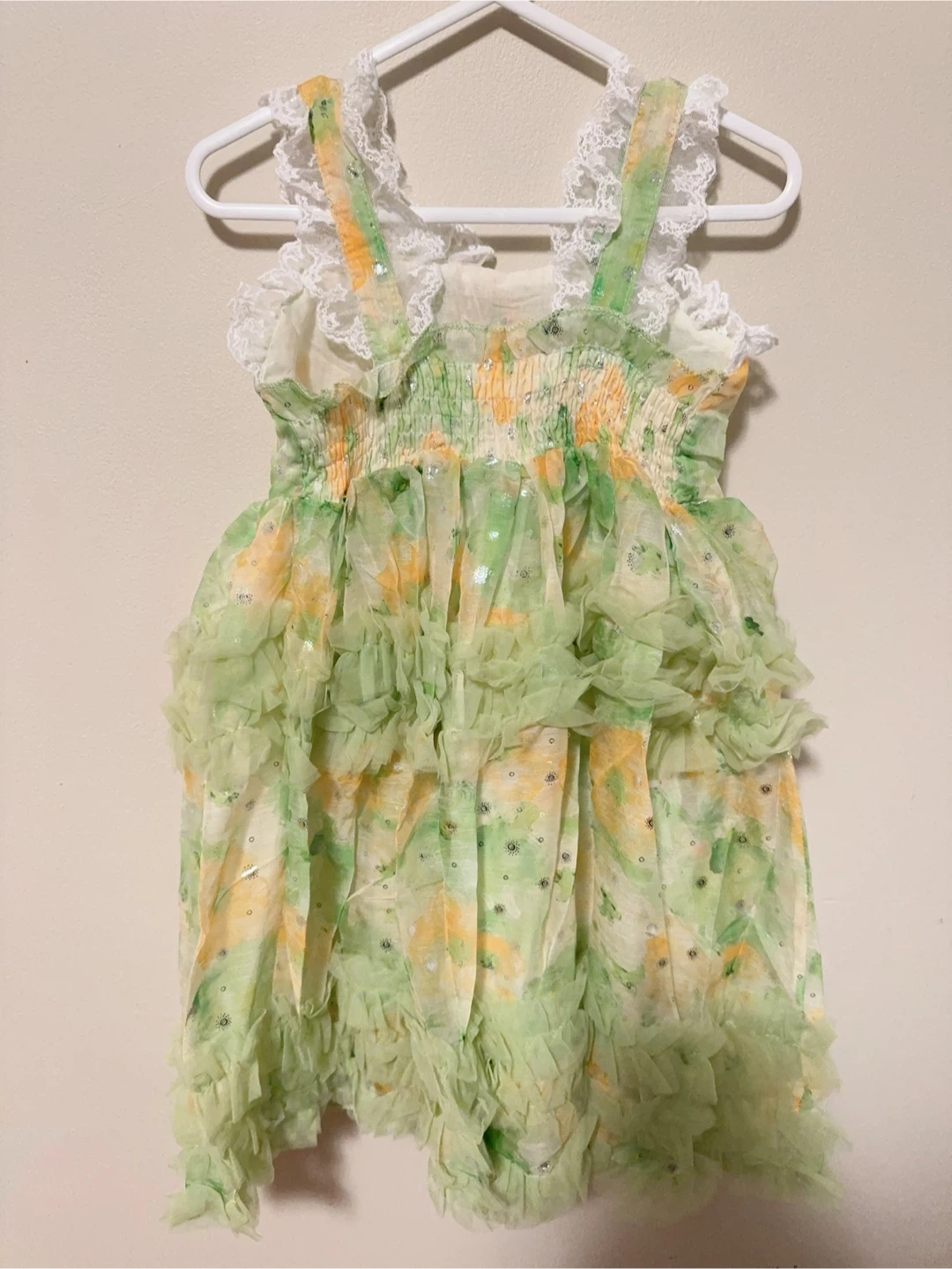 Super cute floral dress with lace trim and ribbon details! It's in great condition and perfect for a special occasion or just to feel fancy. The dress has a layered, ruffled skirt that adds a touch of whimsy.