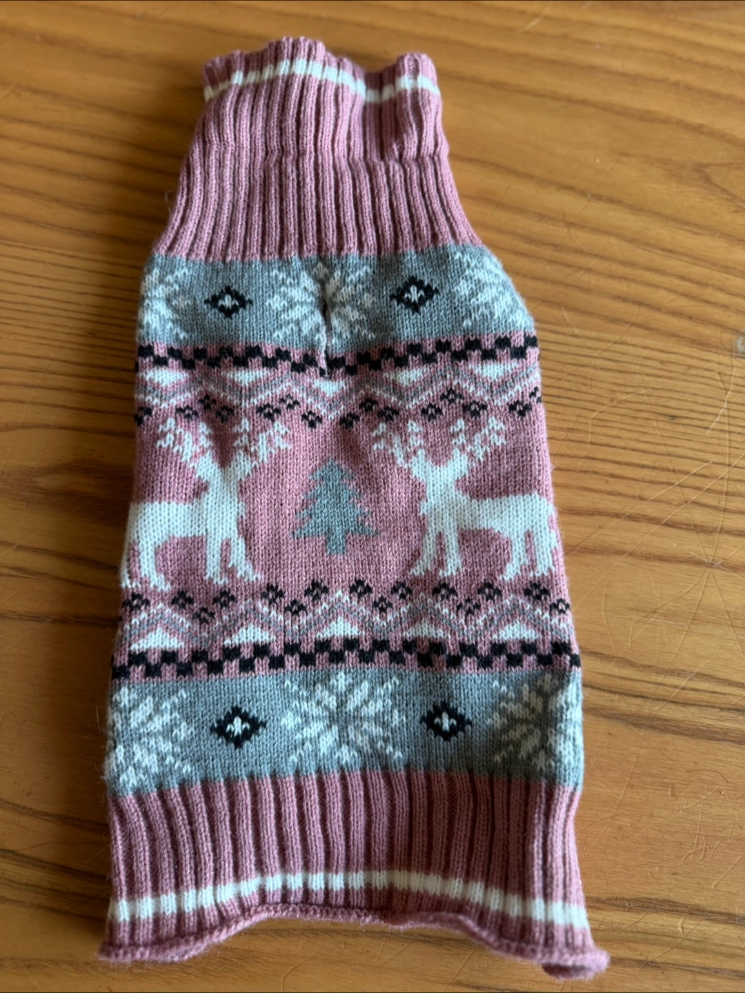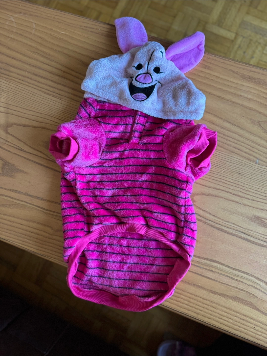 There's a OnePaw red and black plaid puffer coat with a faux fur hood. Also, a pink striped coat with a Piglet hood, and a pink and grey sweater with a reindeer pattern. All are in good condition and ready for a new furry friend!