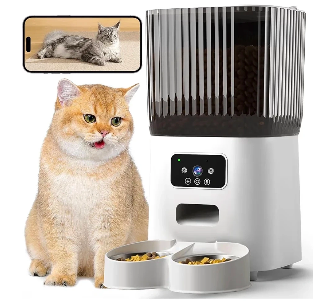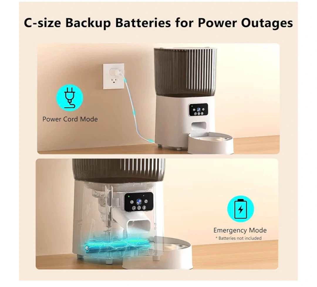 Keep your furry friend fed with this automatic pet feeder! It features dual bowls and can be powered by a power cord or C-size backup batteries for power outages. Perfect for ensuring your pet never misses a meal