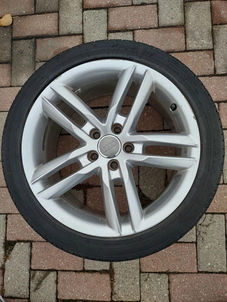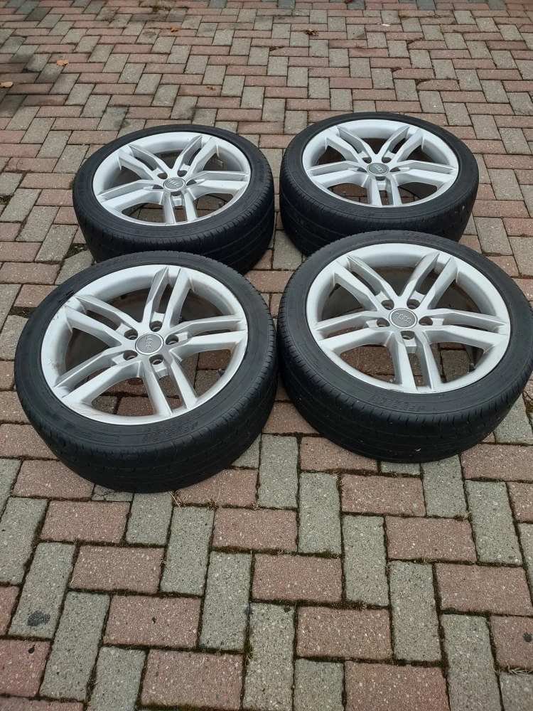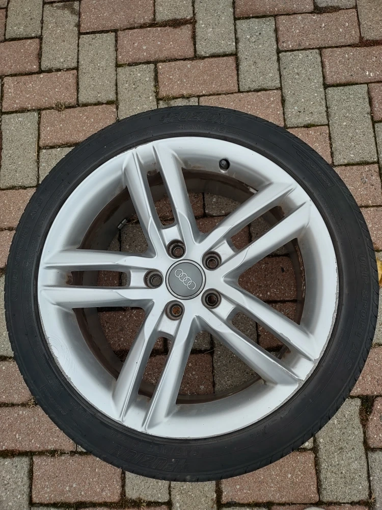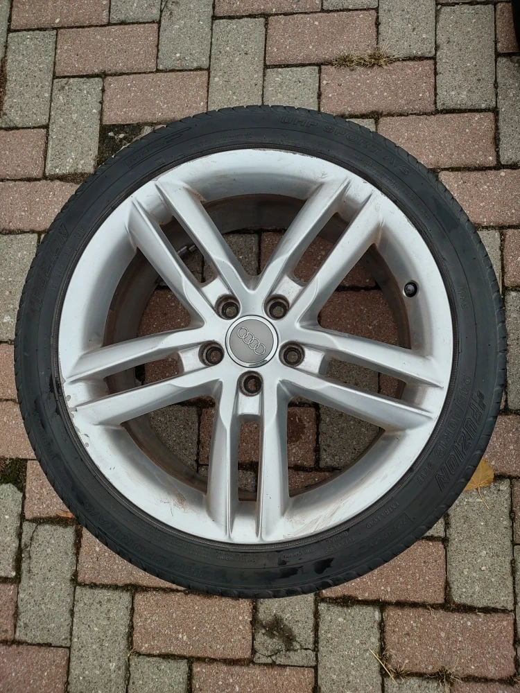 Selling a set of four Audi alloy wheels with tires. The tires are Pirelli P Zero 245/40R18 DOT 8Jx18 . These wheels show some signs of wear, as pictured.