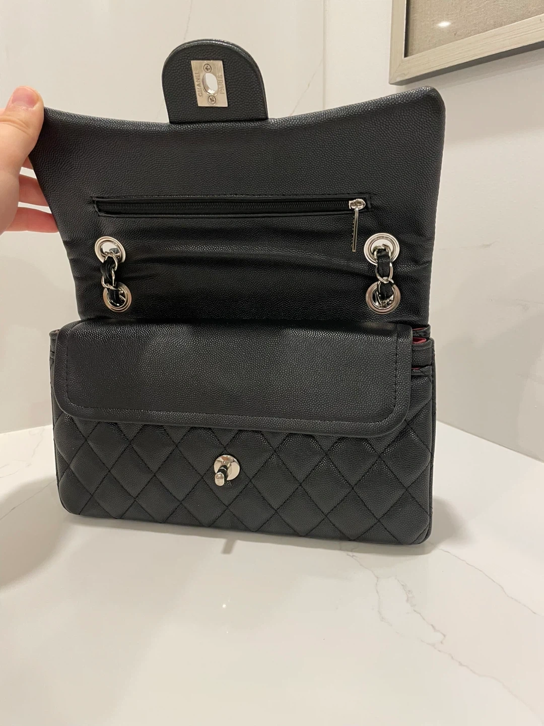 Selling a beautiful Chanel Classic Flap bag in black. It's in new condition and has a timeless design. Perfect for any occasion! Please message for more info
