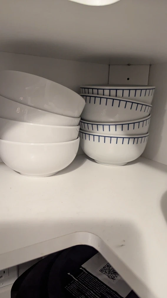 Selling a set of 8 bowls! They are white with a simple, clean design. Four of the bowls have a blue line pattern around the rim, while one is plain white. Perfect for everyday use!