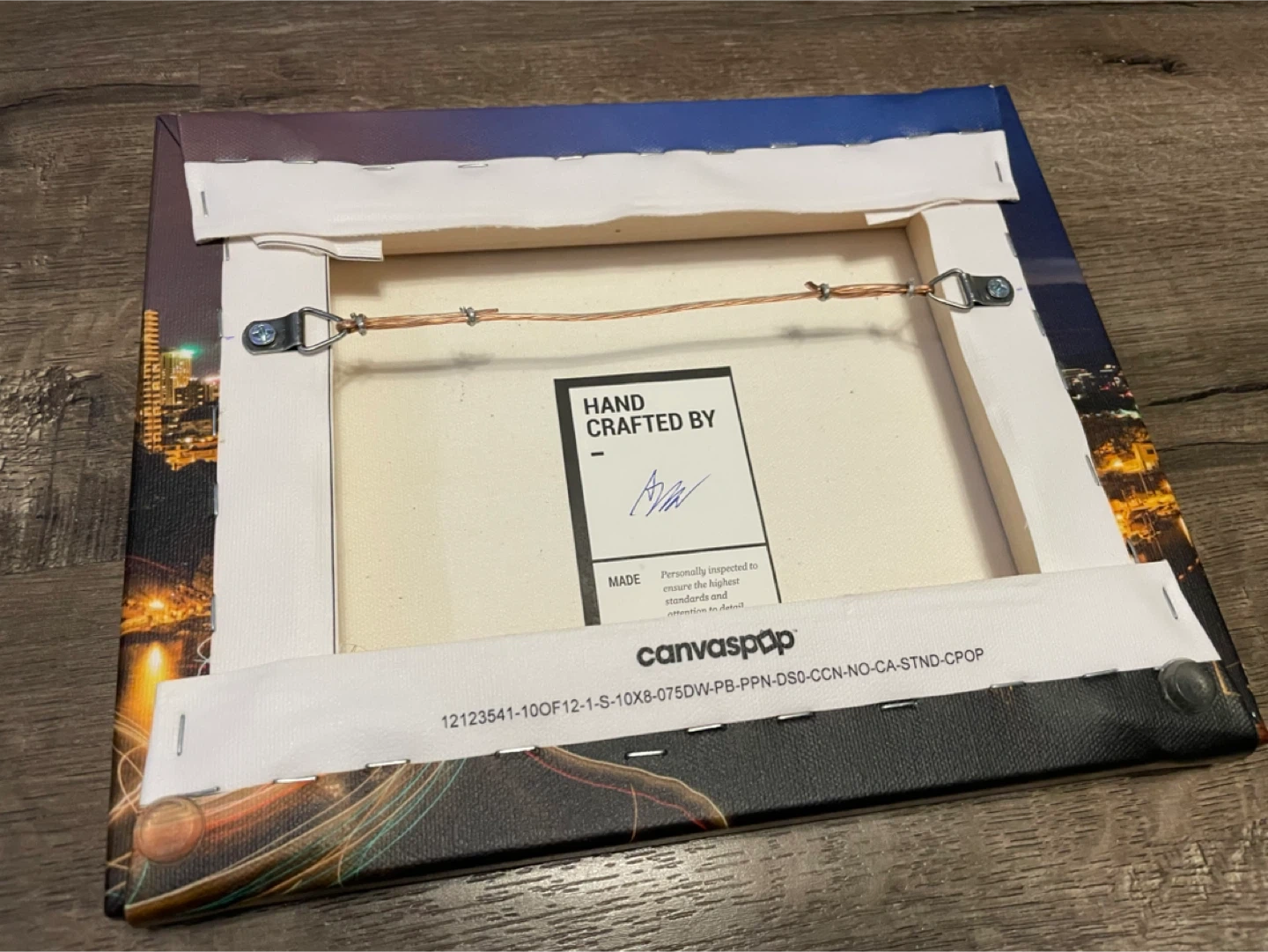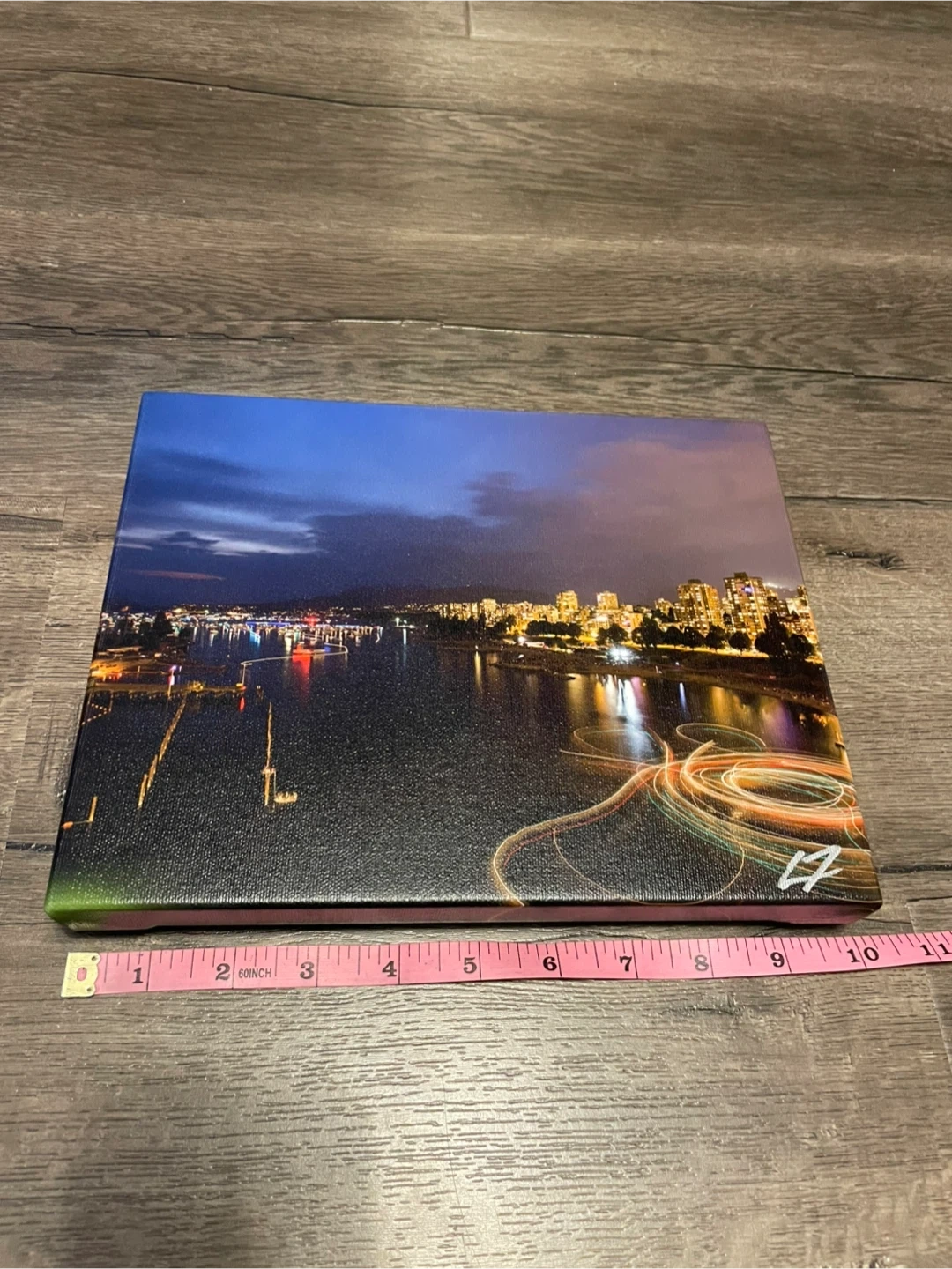 This photo was taken after the fireworks when boats are leaving. The long exposure created the artistic lines. It was printed on a canvas. This is a creative was to showcase Vancouver at night! It measures approximately 10x8 inches, as shown in the photos. It's in great condition and ready to brighten up any room. I have 2 slightly different canevas that are the same size and that could be featured together. Please consider my other prints. Thanks for shopping local.