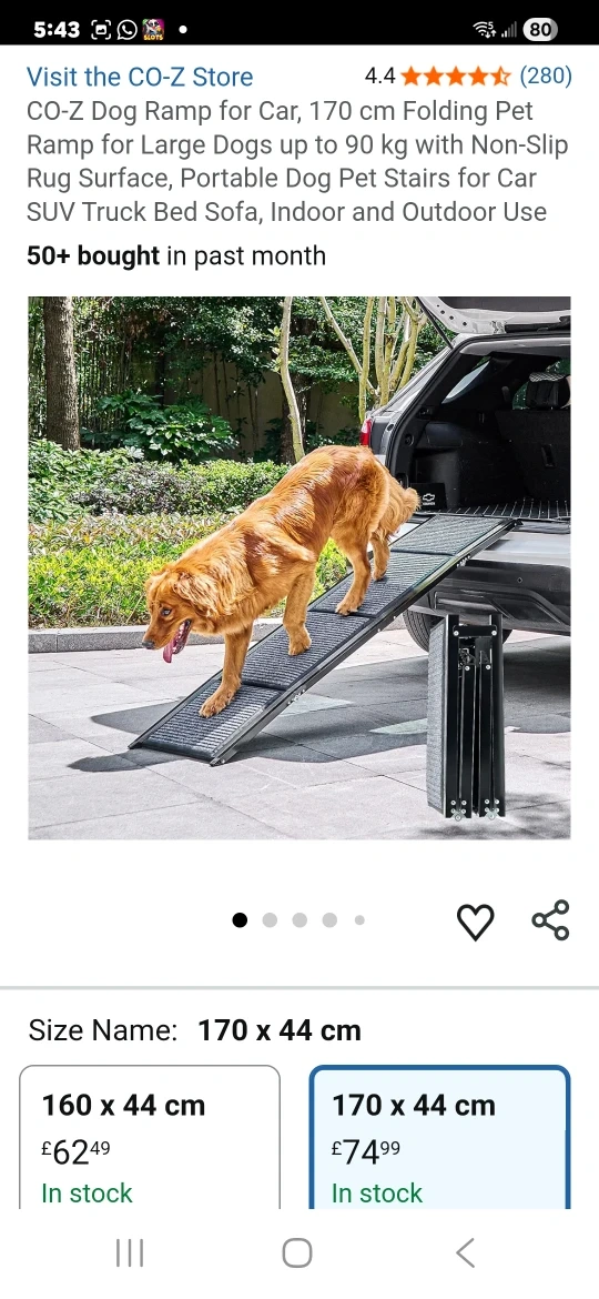 Selling a CO-Z Folding Dog Ramp that's perfect for helping your furry friend get into cars, trucks, or onto furniture! It measures 170 x 44 cm and can support large dogs up to 90 kg. The ramp has a non-slip rug surface, making it safe and easy for your pet to use. It's lightweight and portable, and folds up for easy storage. Comes with the original box! Price firm