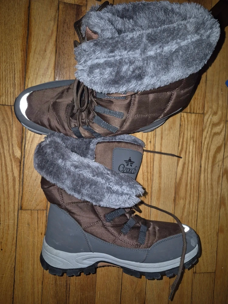 Selling a pair of Qvekos winter boots in size 8. They're in good condition and perfect for keeping your feet warm and dry this winter. The boots have a sturdy sole for good traction and a cozy faux fur lining.