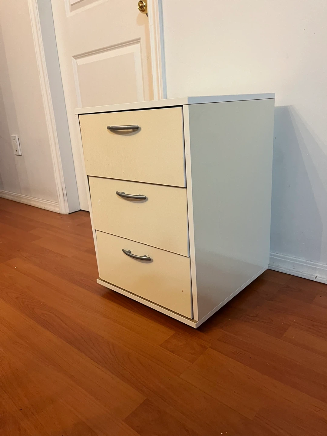 Selling a cream-coloured night stand with three drawers. . Perfect for extra storage and it’s on the wheels.