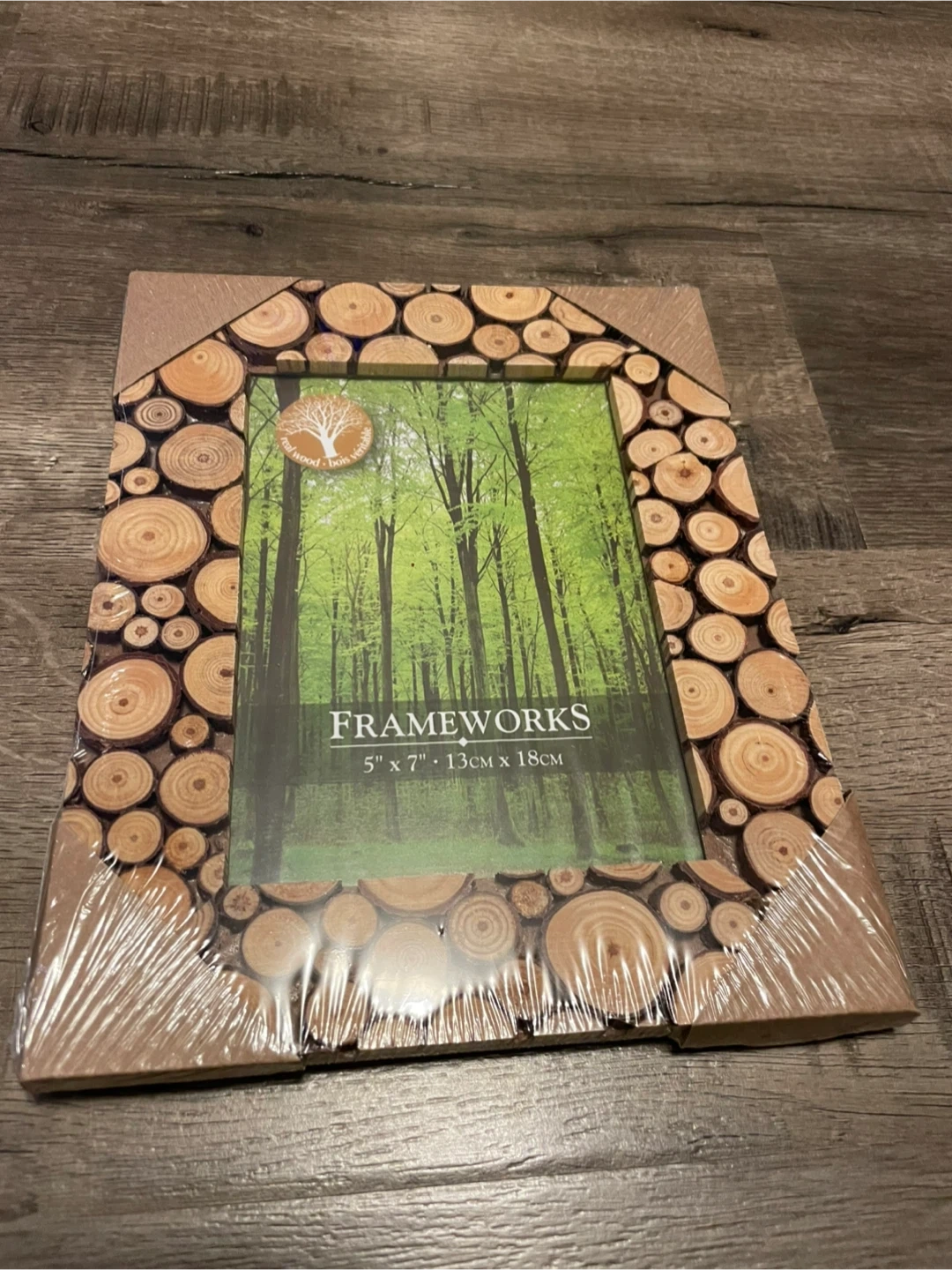 Selling a brand new Frameworks picture frame! It's still in its original packaging. The frame is 5" x 7" (13cm x 18cm) and features a unique design with wood logs around the border. Perfect for displaying your favourite photos!
