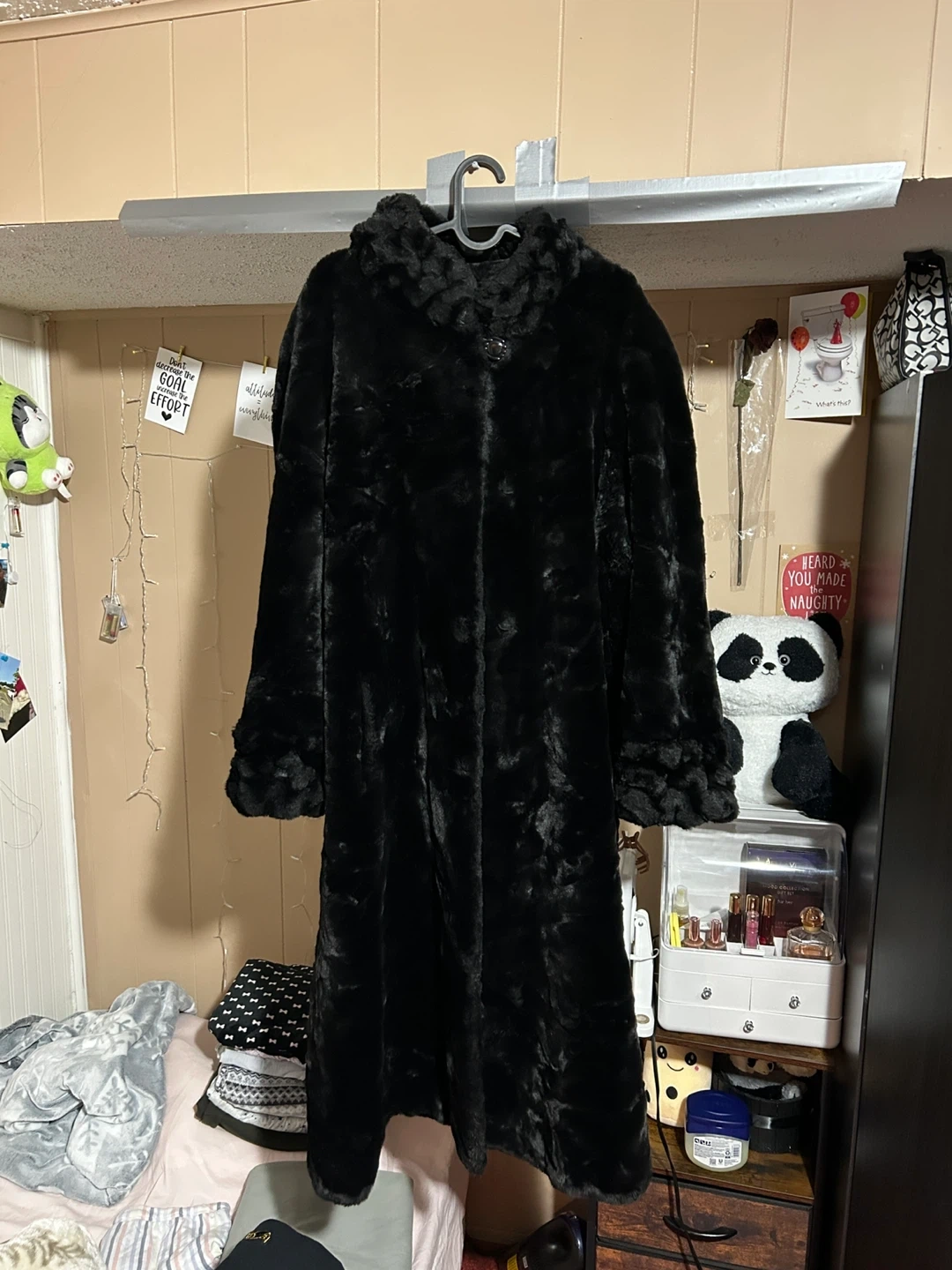 Selling a lovely black fur coat. It's in great condition and ready to keep you warm this winter! The material is soft and plush, perfect for adding a touch of elegance to any outfit
