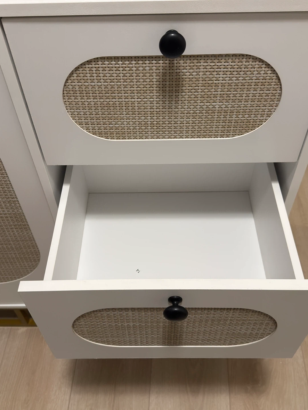 This accent cabinet is in great shape and ready for a new home! It features a white finish with rattan door and drawer fronts, and a stylish gold-tone base. It measures approximately 1.18 meters wide, 88 cm tall, and 37 cm deep. Perfect for adding storage and style to any room!