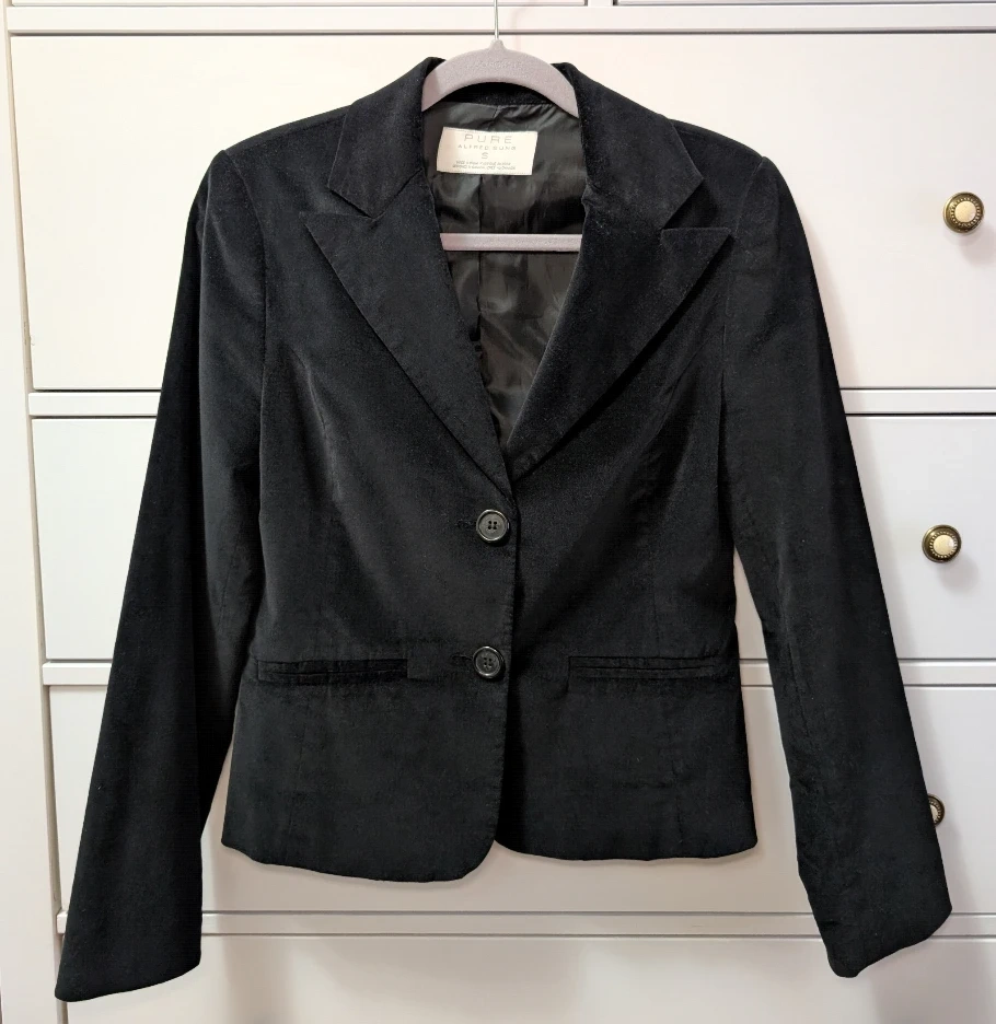 Here's a stylish black velvet blazer from PURE by Alfred Sung. It's a size small and would be a great addition to your wardrobe & perfect for the holiday season.