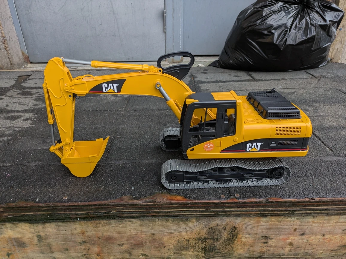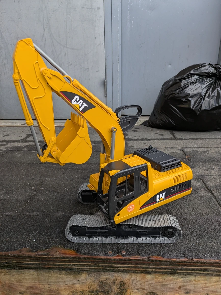 Bruder toy Cat Excavator . Made of plastic , push toy , swivels , boom works . 1:16 scale , measures 1 1/2 feet tall with boom up and 2 feet long with boom extended . In very good condition . Cash payment please , thanks for looking .