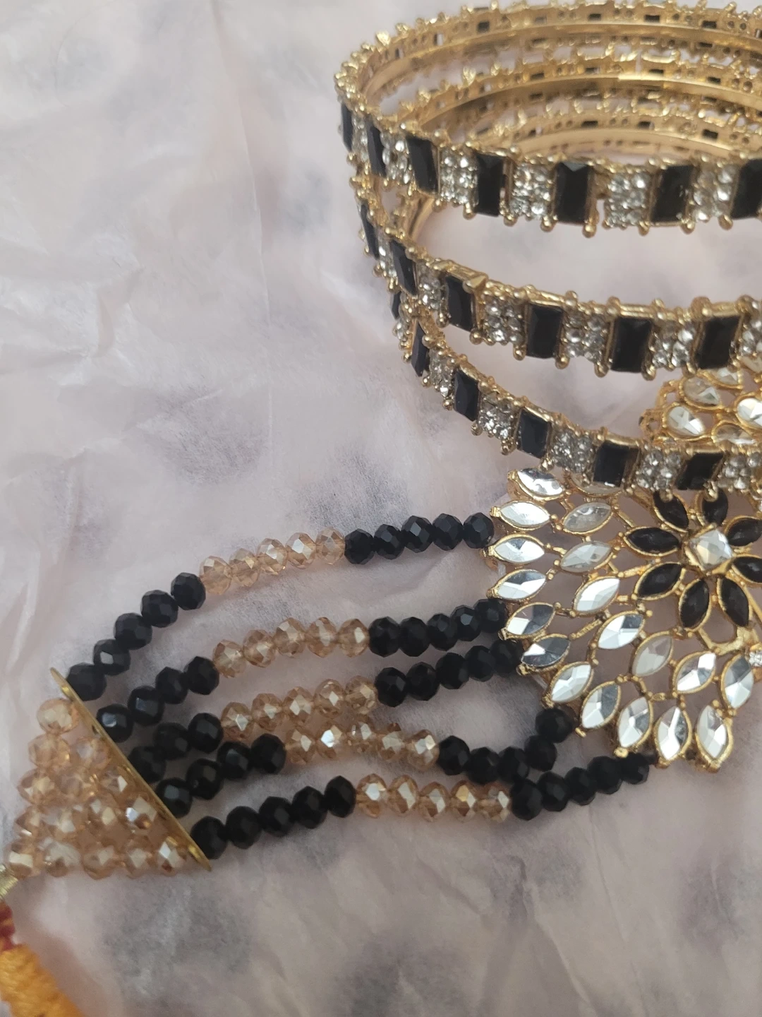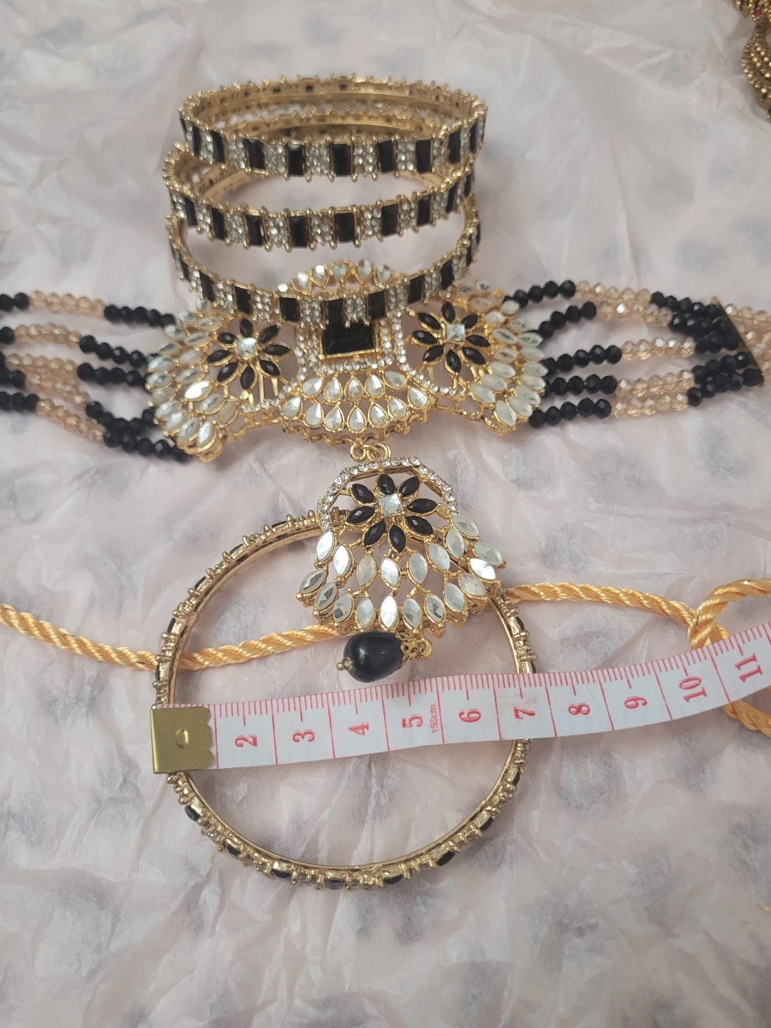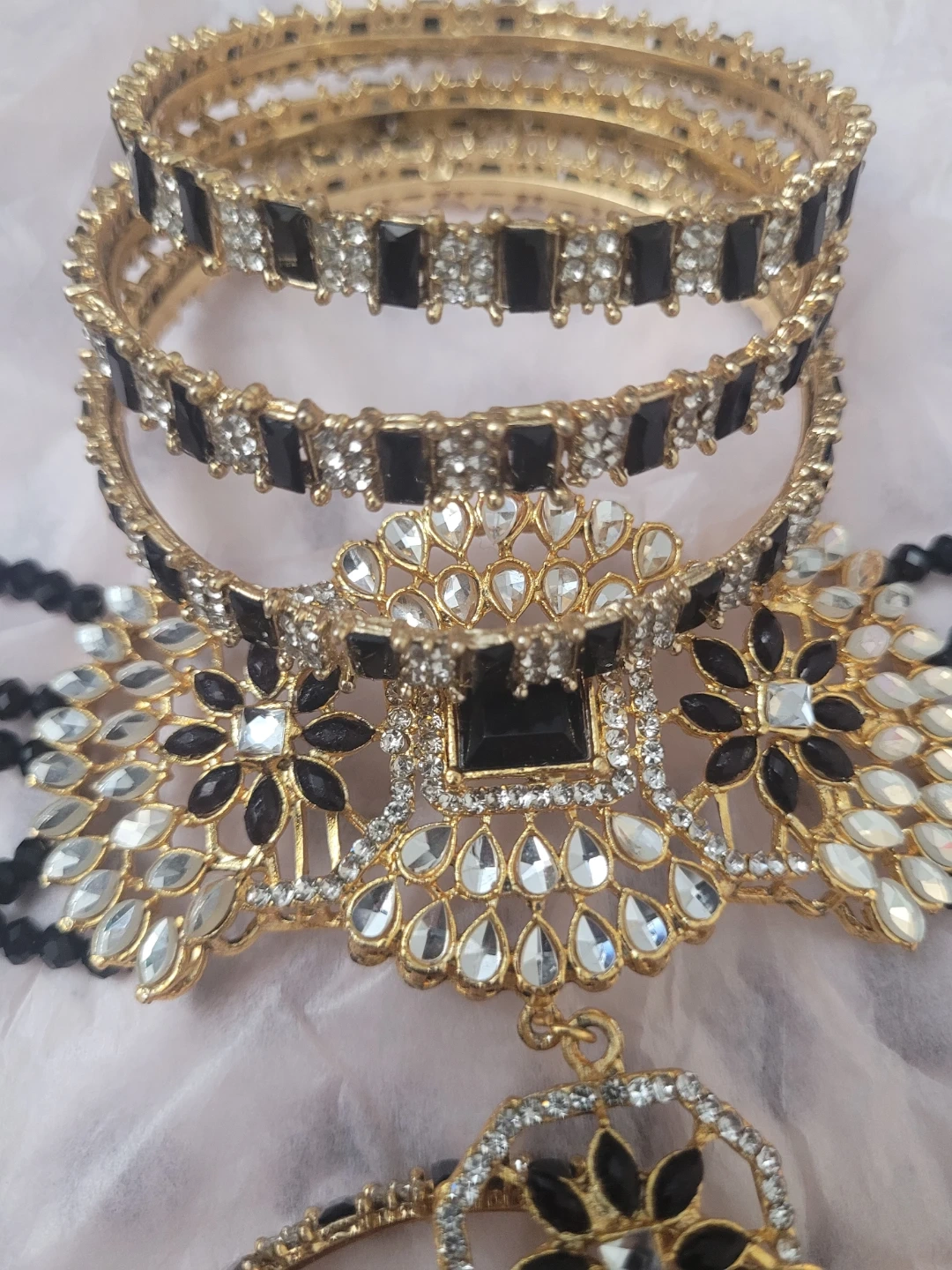 Beautiful necklace and bangle set in gold and black. The bangles have black stones set in a gold band, and the necklace has a matching pendant with black and clear stones. Great for parties or dressing up an outfit!
