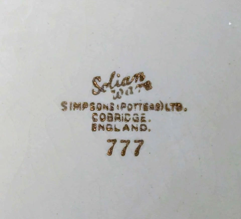 A beautiful and ornate vintage decorative plate by Solian Ware, Simpsons Potters Ltd. Features a vibrant apple green border with an intricate gold overlay (likely 22K gold trim) and a central bouquet of pink, purple, blue, and yellow flowers. This is an original piece of English-made ceramic tableware, likely dating from the mid-20th century (1930s-1960s). Approximately 10.5 to 11 inches in diameter (a large dinner or display plate). Part of the "Ambassador Ware" or pattern #777 line from the Cobridge, England pottery company. Perfect for collectors of vintage china, home decor enthusiasts, or as a unique gift.