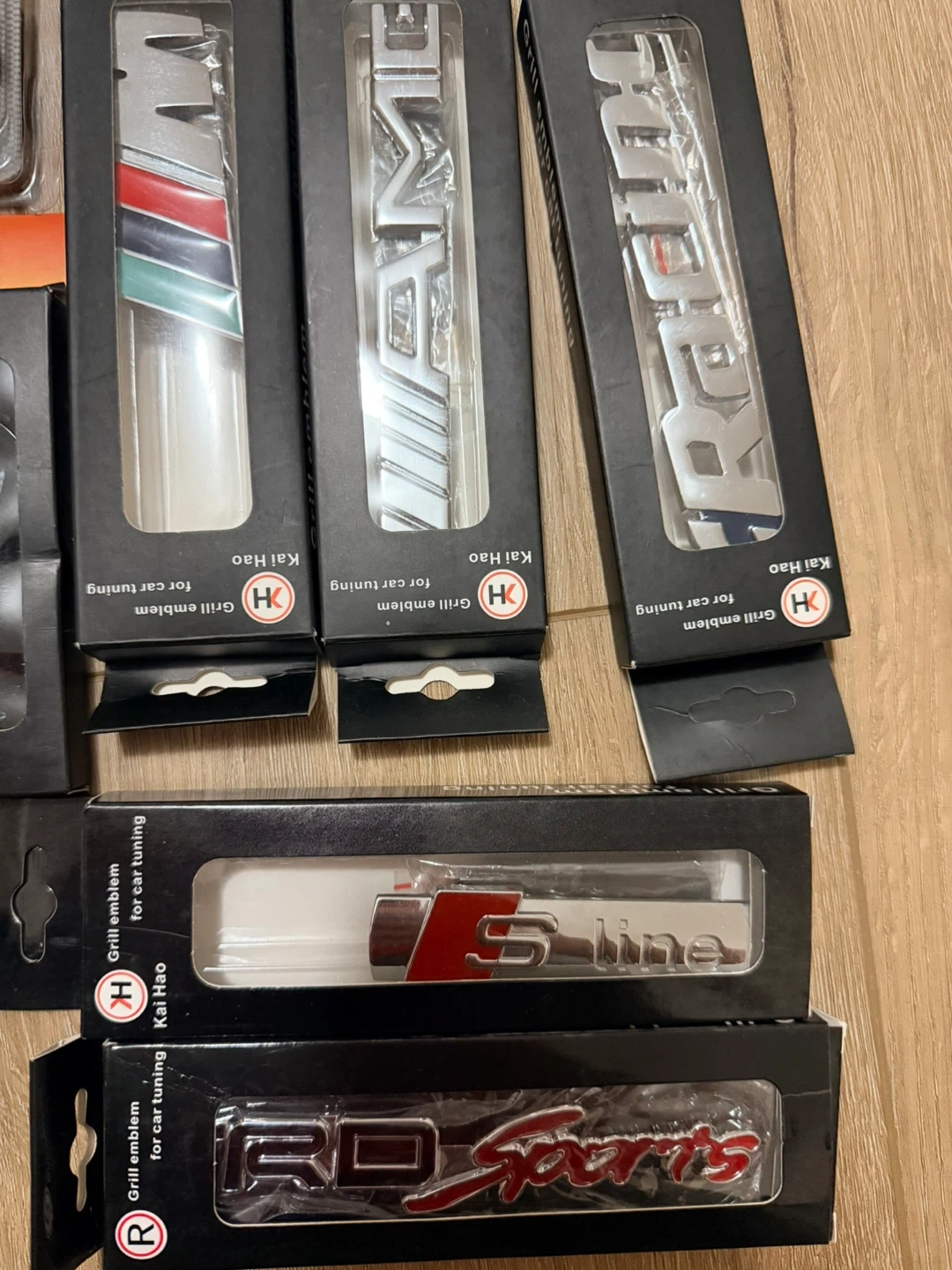 Selling a variety of car emblems and tire valves. There are emblems for different car brands such as Mini, Toyota, Nissan, Audi, and more! They are all new in box。