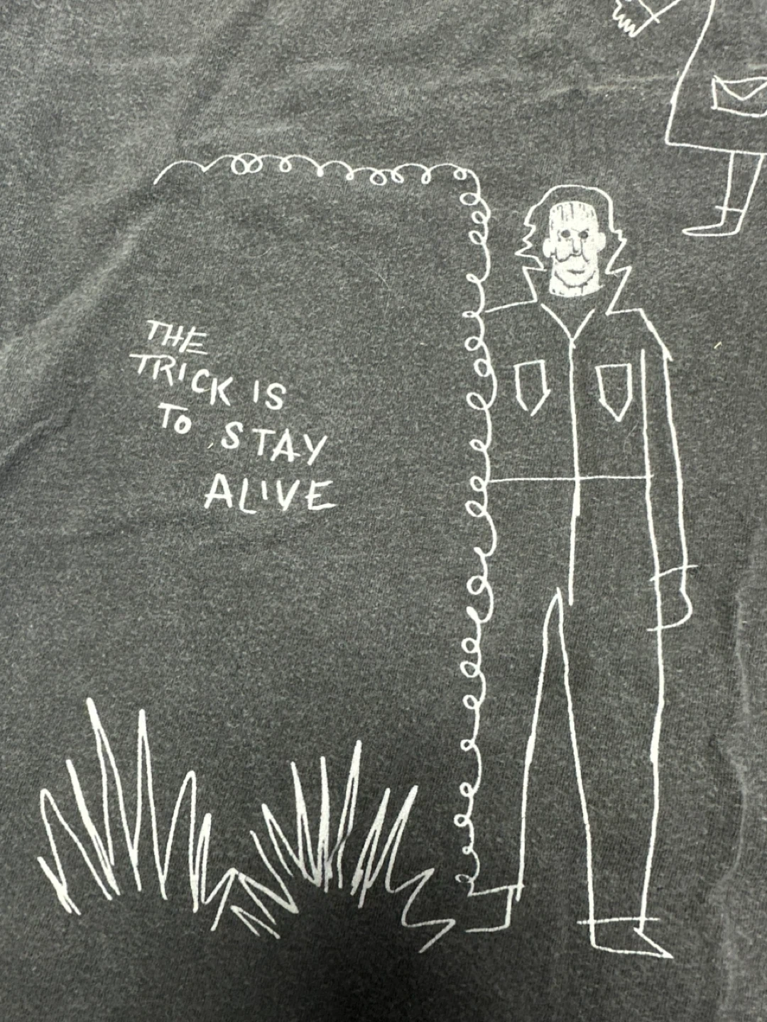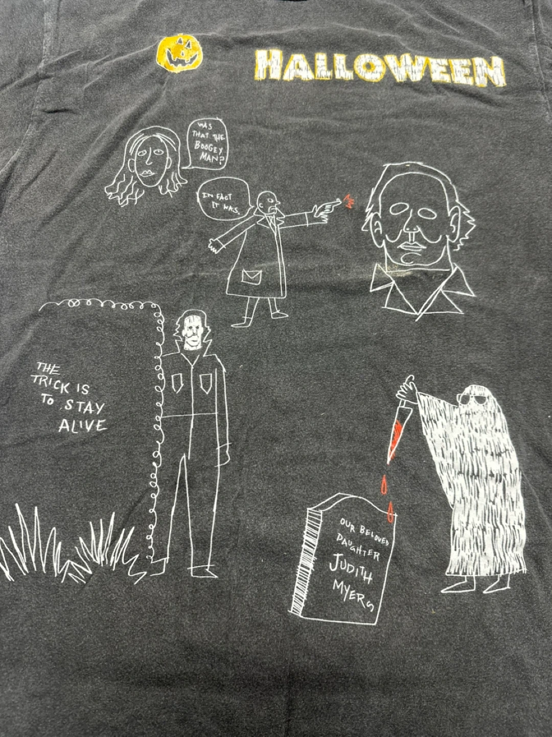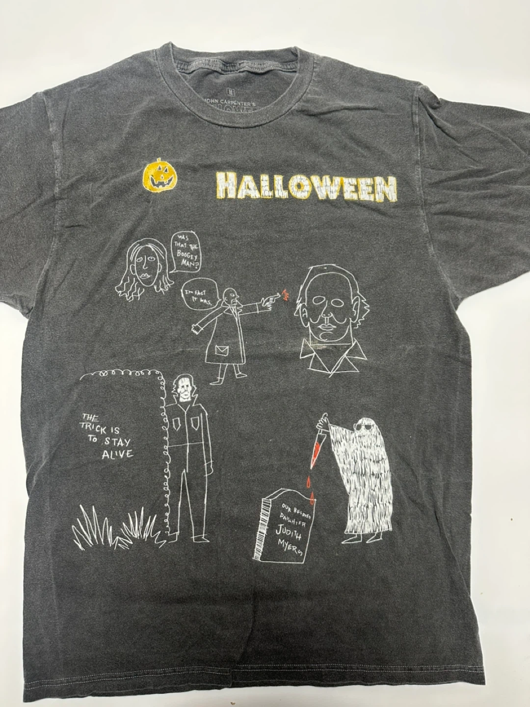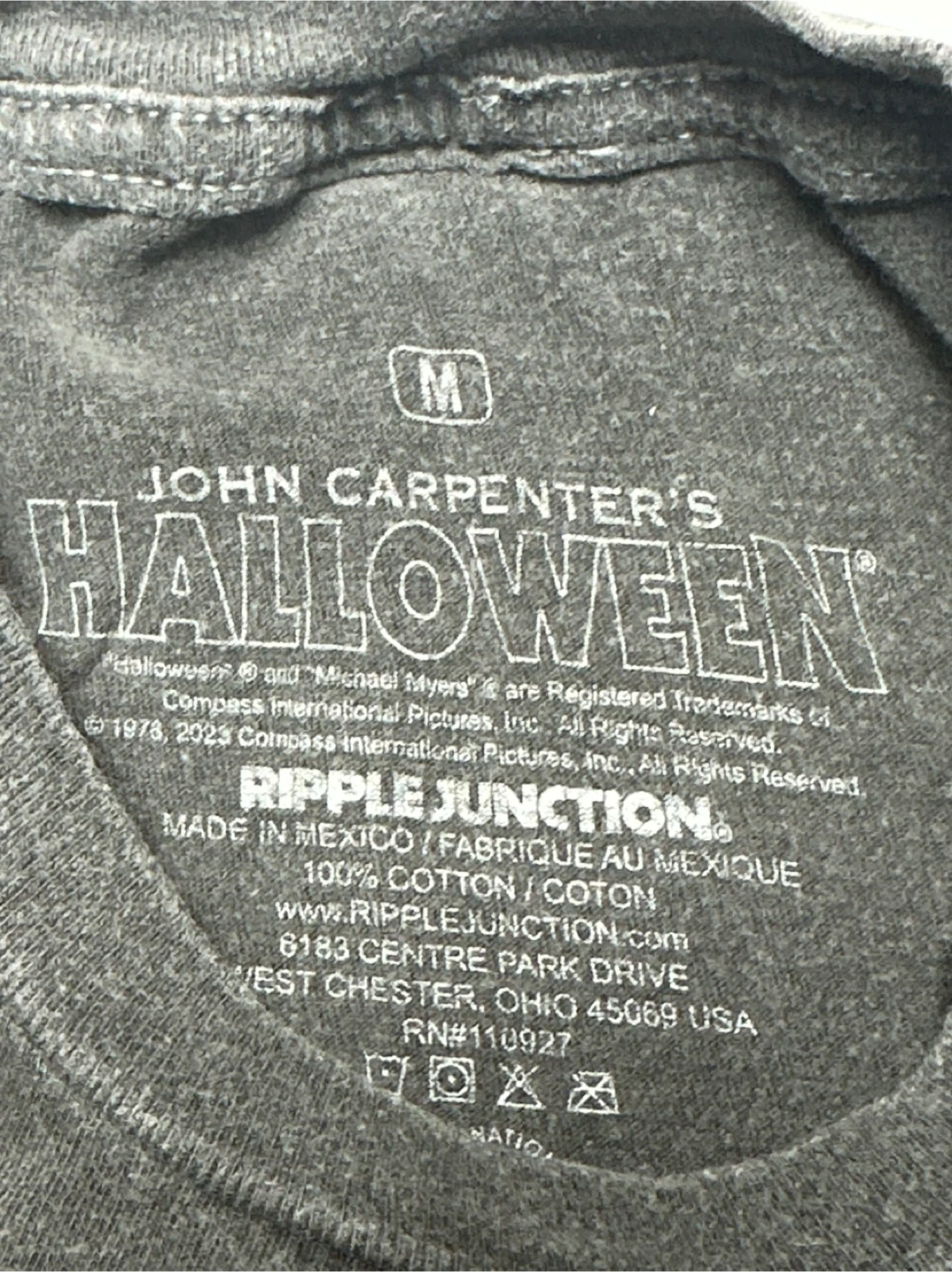 Selling a John Carpenter's Halloween T-Shirt in size medium. The shirt is made of 100% cotton. It features a unique design with characters and elements from the iconic Halloween movie. Perfect for any horror fan!