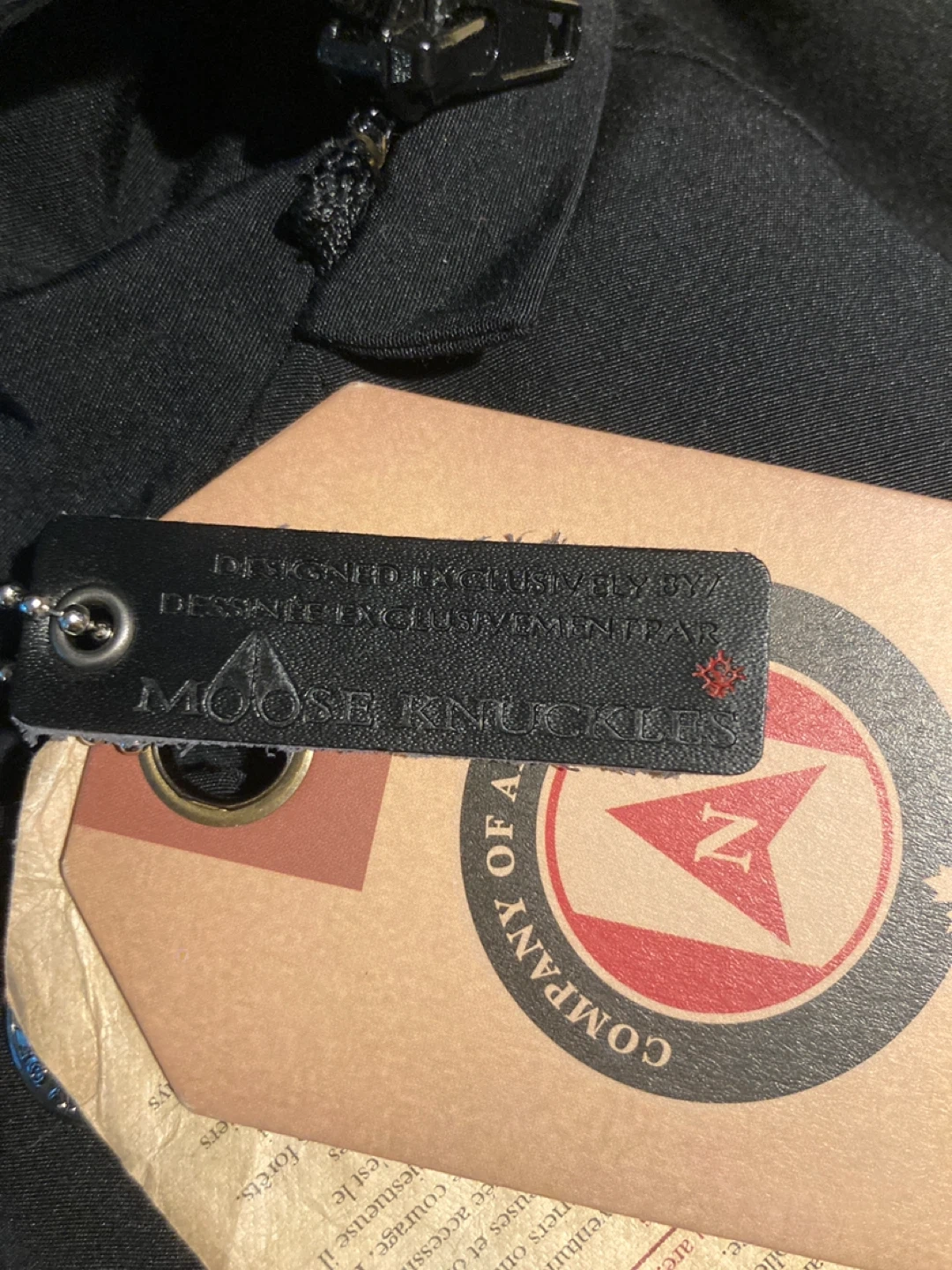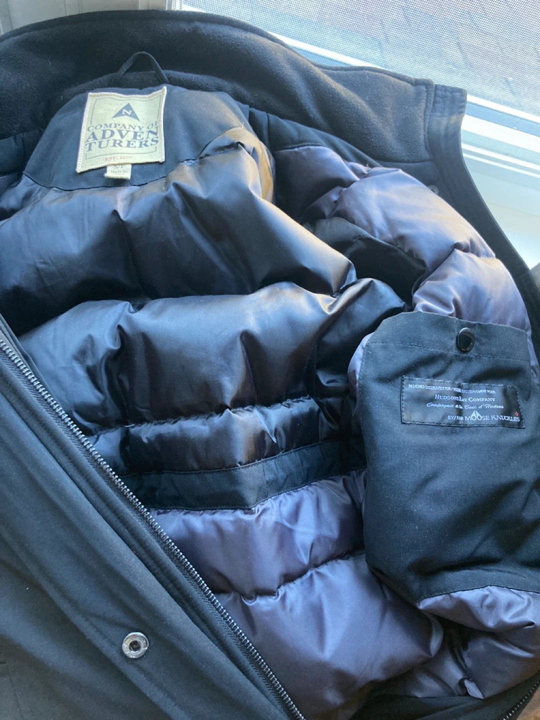 Keep warm with this Moose Knuckles and Hudson’s Bay Company black down parka! It's a size small women’s and features:
