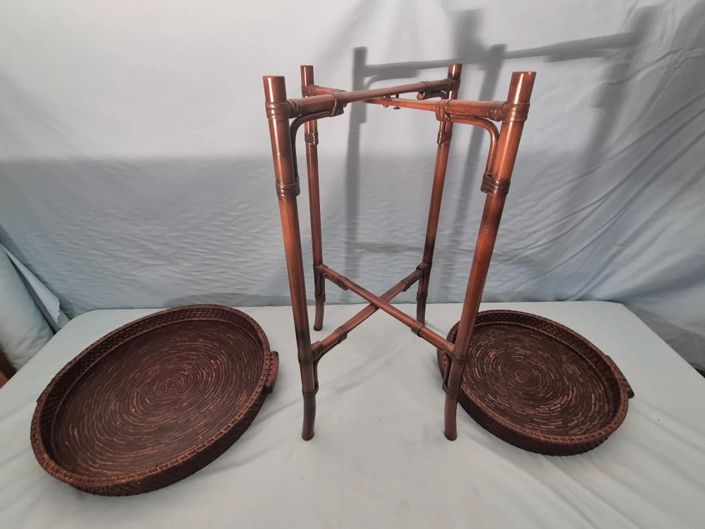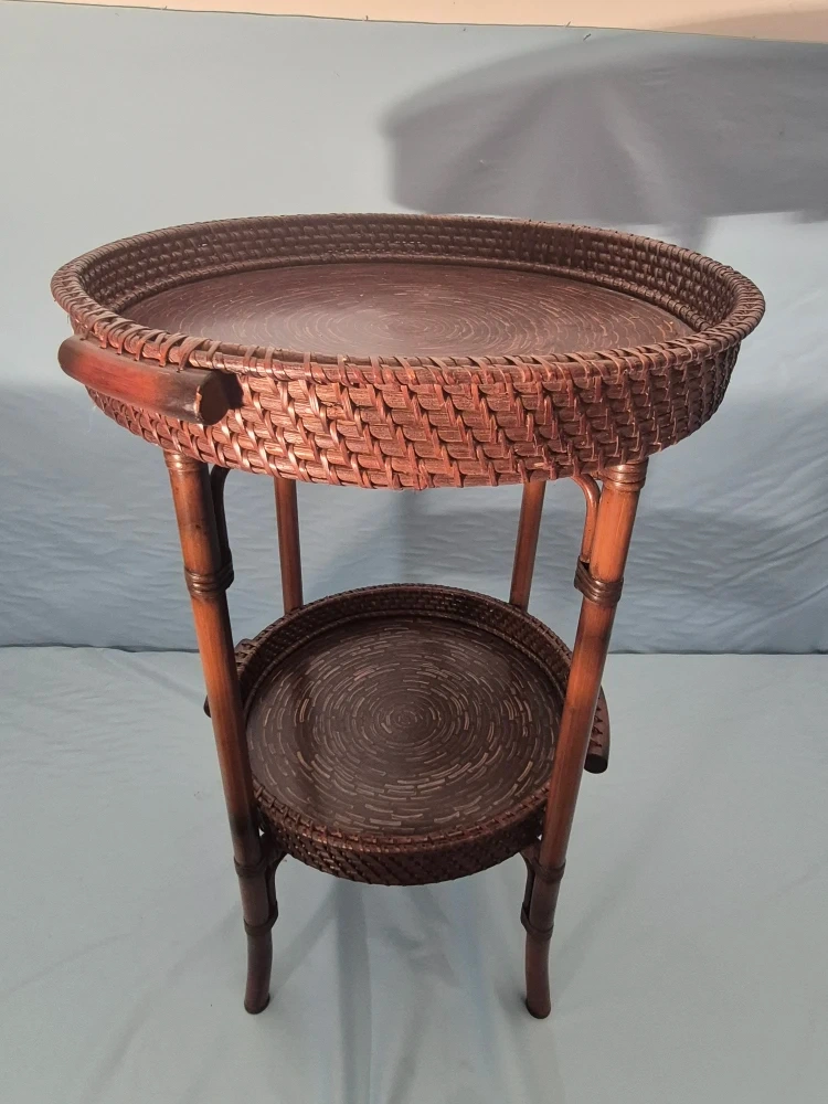 I'm selling a lovely wicker side table featuring two tiers. It's perfect for adding a touch of rustic charm to any room. It's in great shape and ready for a new home!