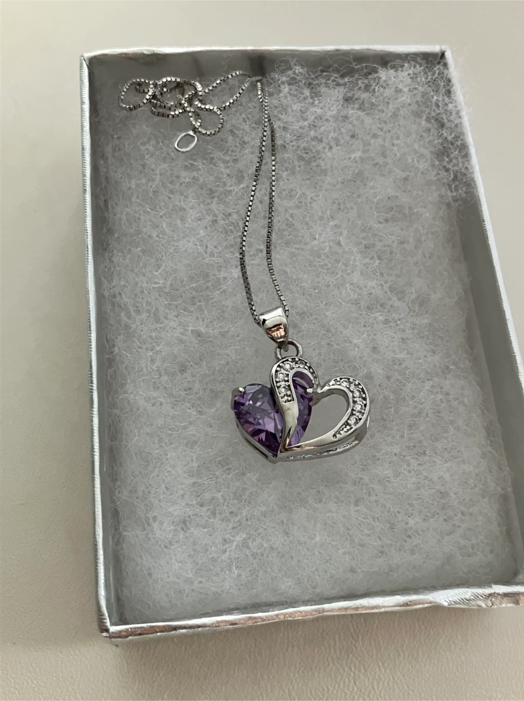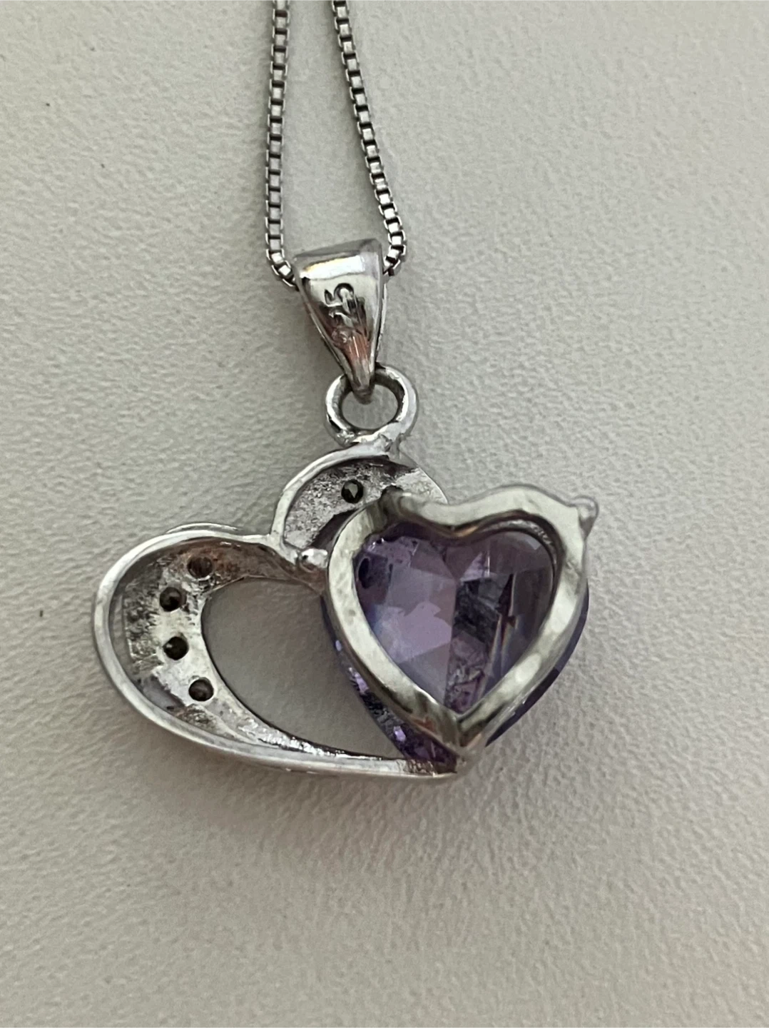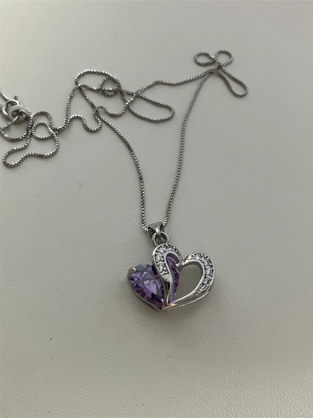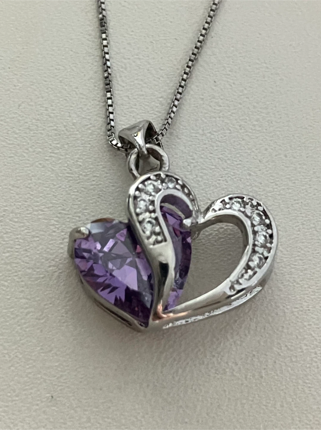 Selling a lovely 925 Sterling silver heart pendant necklace. It features a beautiful purple stone accent and smaller clear stones around the heart design. The chain is 925 Sterling Silver 18" included and it comes in a box!