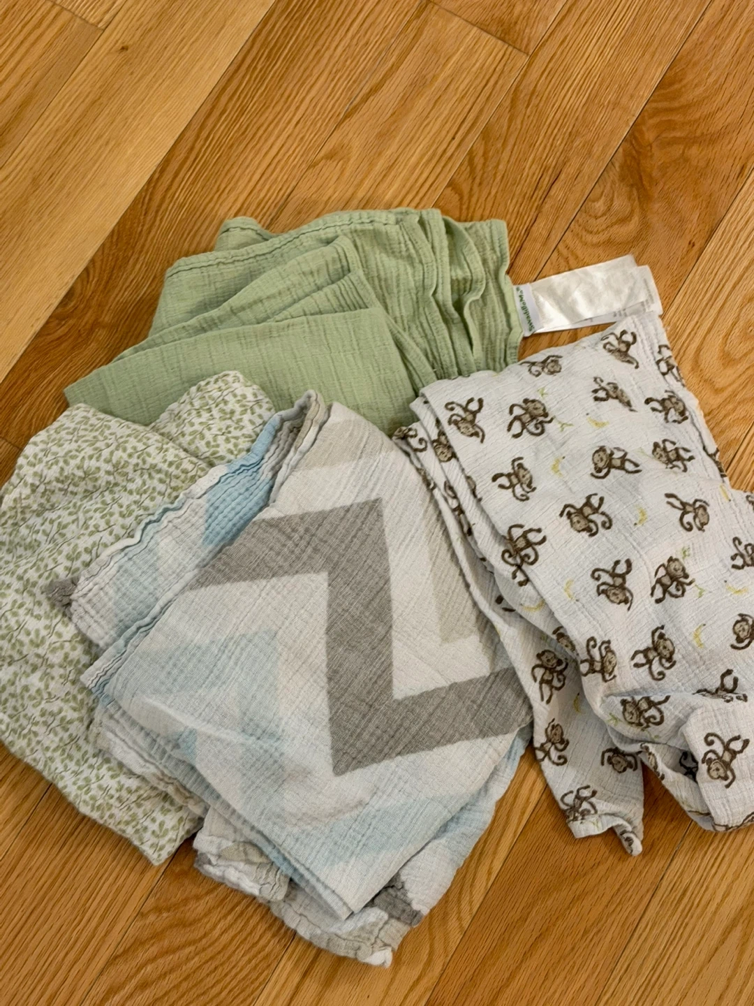 Selling a set of muslin baby swaddle blankets. They are soft and gentle on baby's skin and great for swaddling, nursing covers, or as a light blanket. There are a variety of prints and colours included!