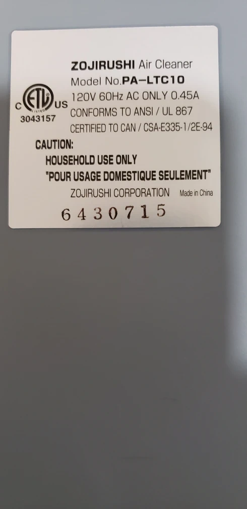 Selling a Zojirushi Ultra Slim Air Purifier, model PA-LTC10. It's in great condition and comes with the original box. This air purifier is designed for household use and is certified to meet safety standards. It measures approximately 15 inches by 15 inches.