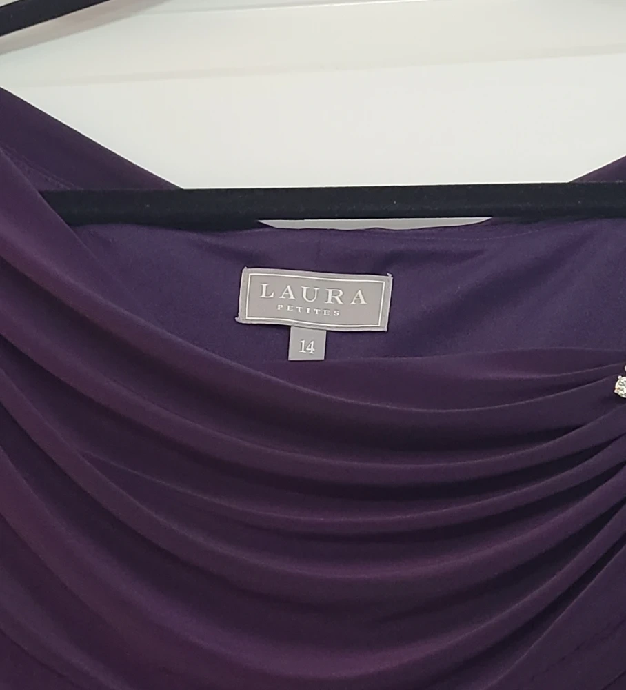 Selling a lovely Laura Petites dress in size 14. It's a beautiful dark purple colour and in great condition! It features a scoop neckline with a brooch & tiered layer design. Perfect for a special occasion or event!