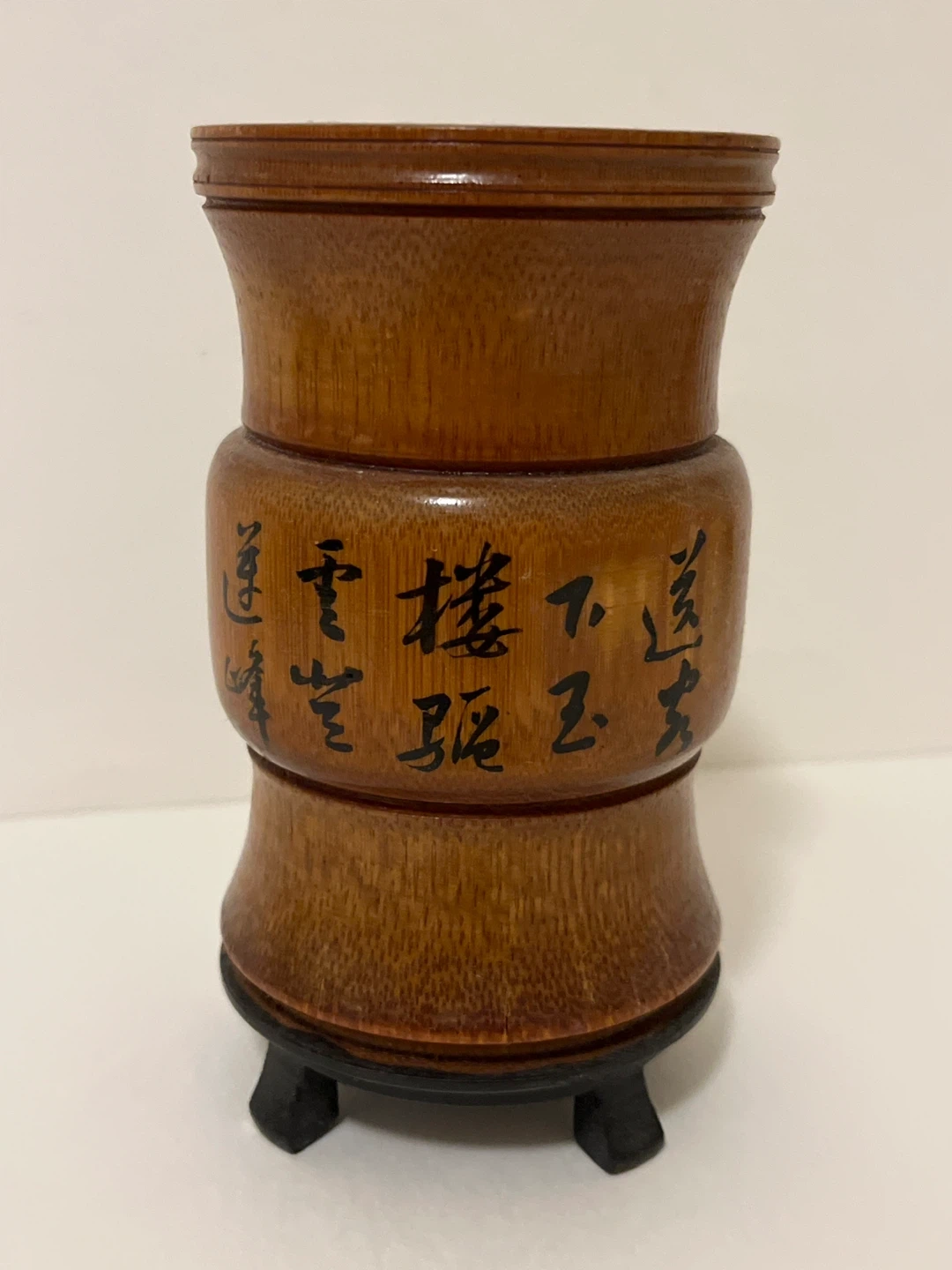 This is a striking bamboo pen holder, adorned with traditional Chinese calligraphy and landscape art, perfect for adding an elegant touch to any desk or collection.