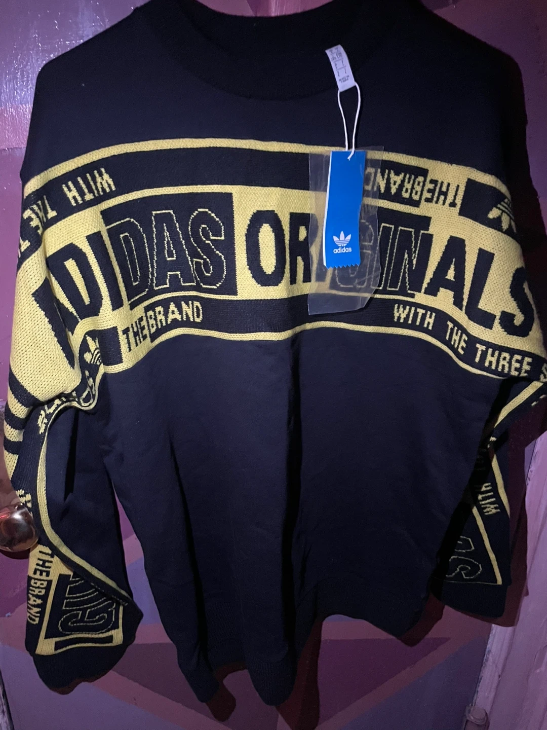 Selling a brand new Adidas Originals Real Scarf Crew sweatshirt! It's a size L and features a cool design with the Adidas Originals logo and "The Brand with the Three Stripes" text. The original tag is still attached, showing it originally retailed for $90!