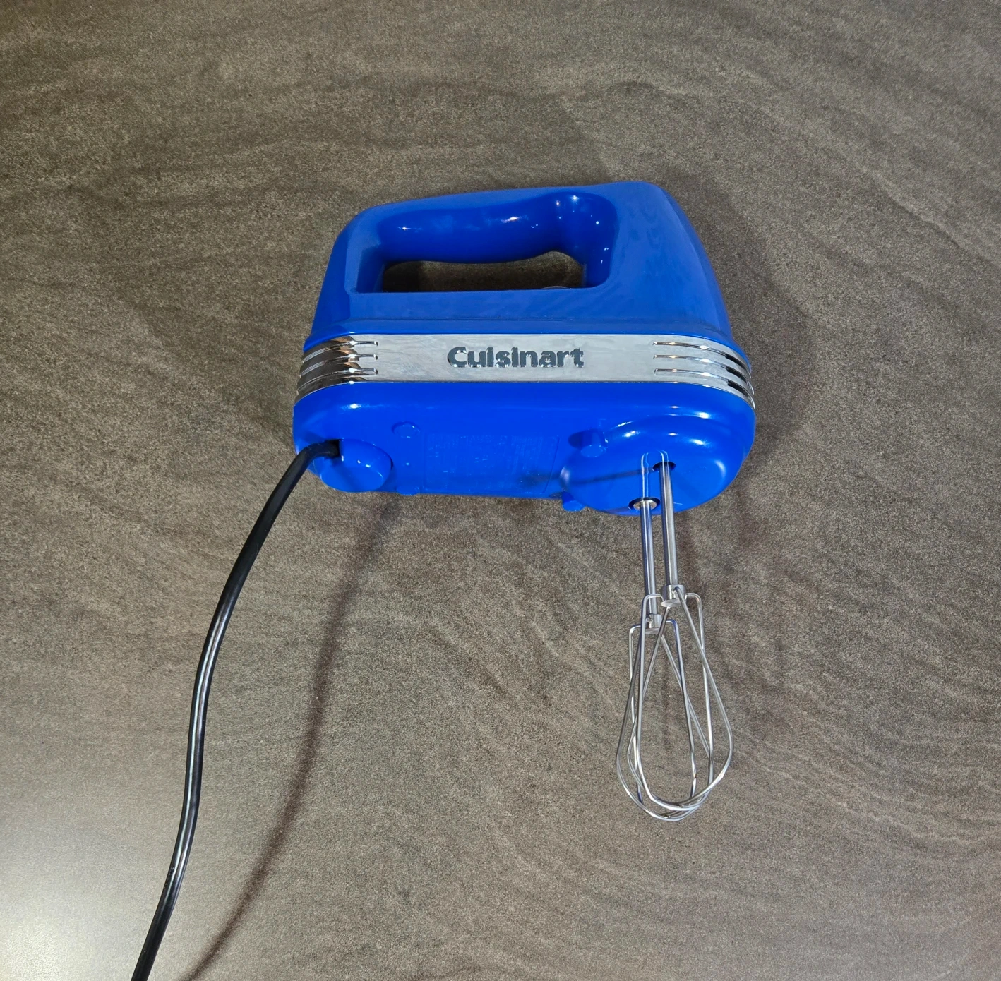 Like new. Has a powerful 220-watt motor with automatic feedback. SmoothStart feature uses three low speeds to prevent splattering of ingredients. Extra-long beaters are designed without a center post for easier cleaning. Exclusive swivel cord allows for both right and left handed use. Cross-posted.